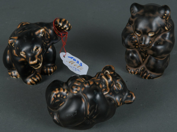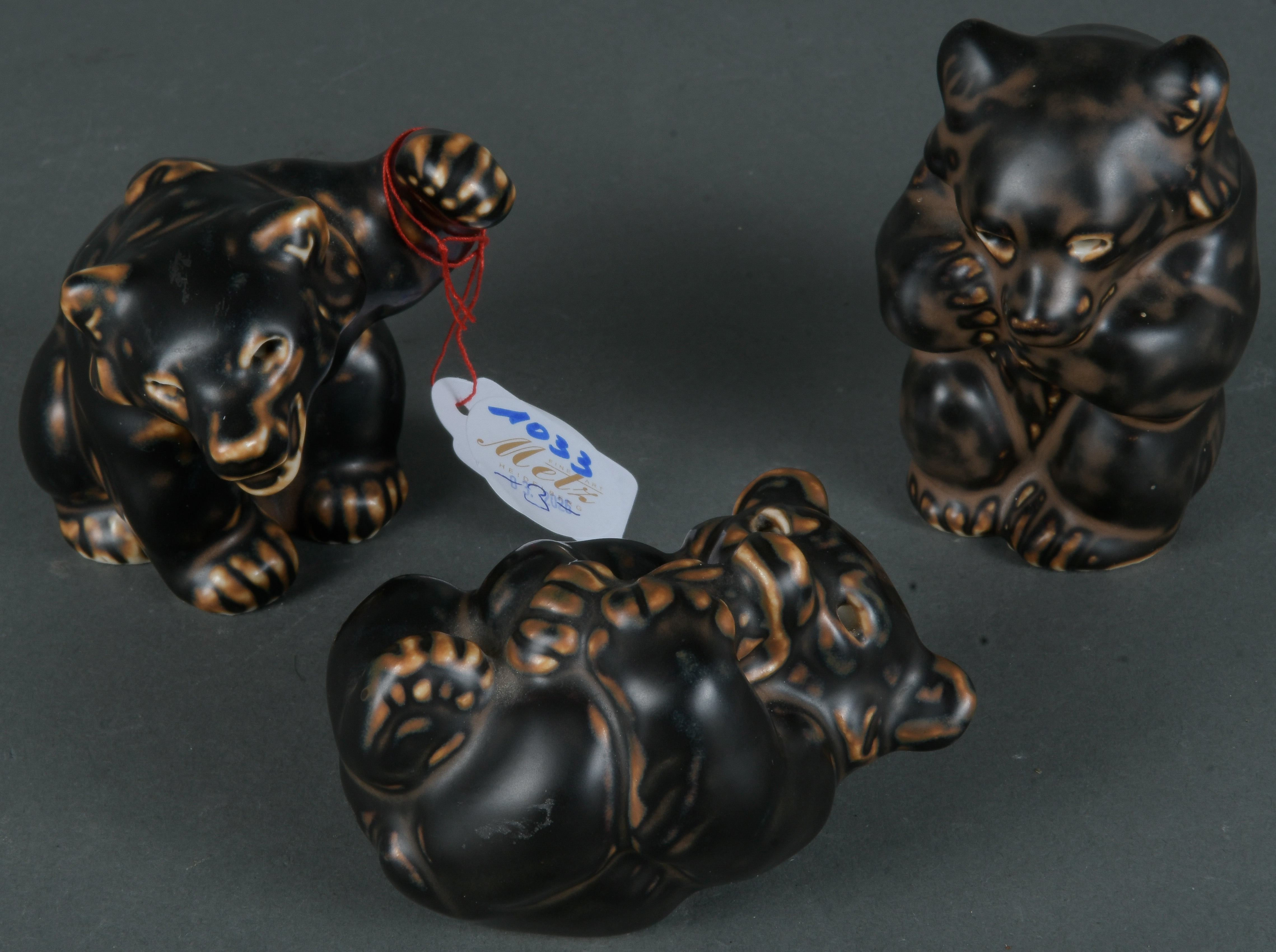 - Katalog-Nr: 1033Drei Bären. Royal Copenhagen 20. Jh. Steingut, am Boden gemarkt, Entwurf von Knud Kyhn, H=6 bis 9 cm.o.L.