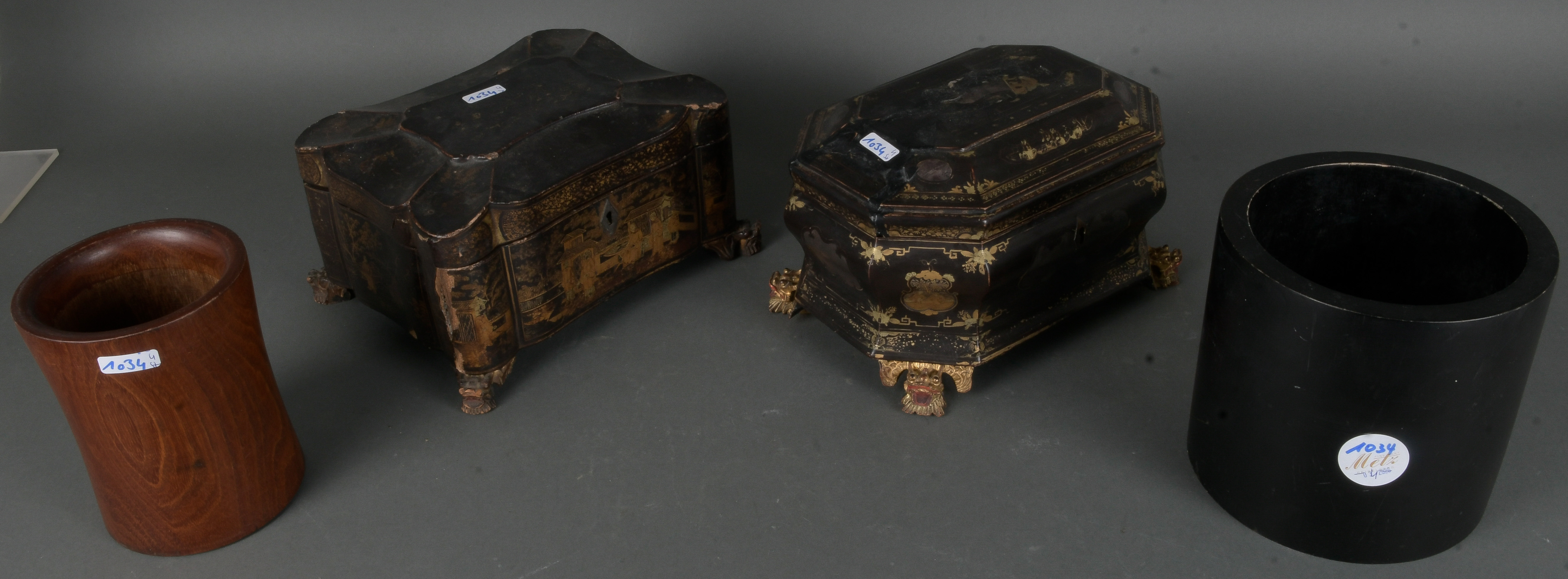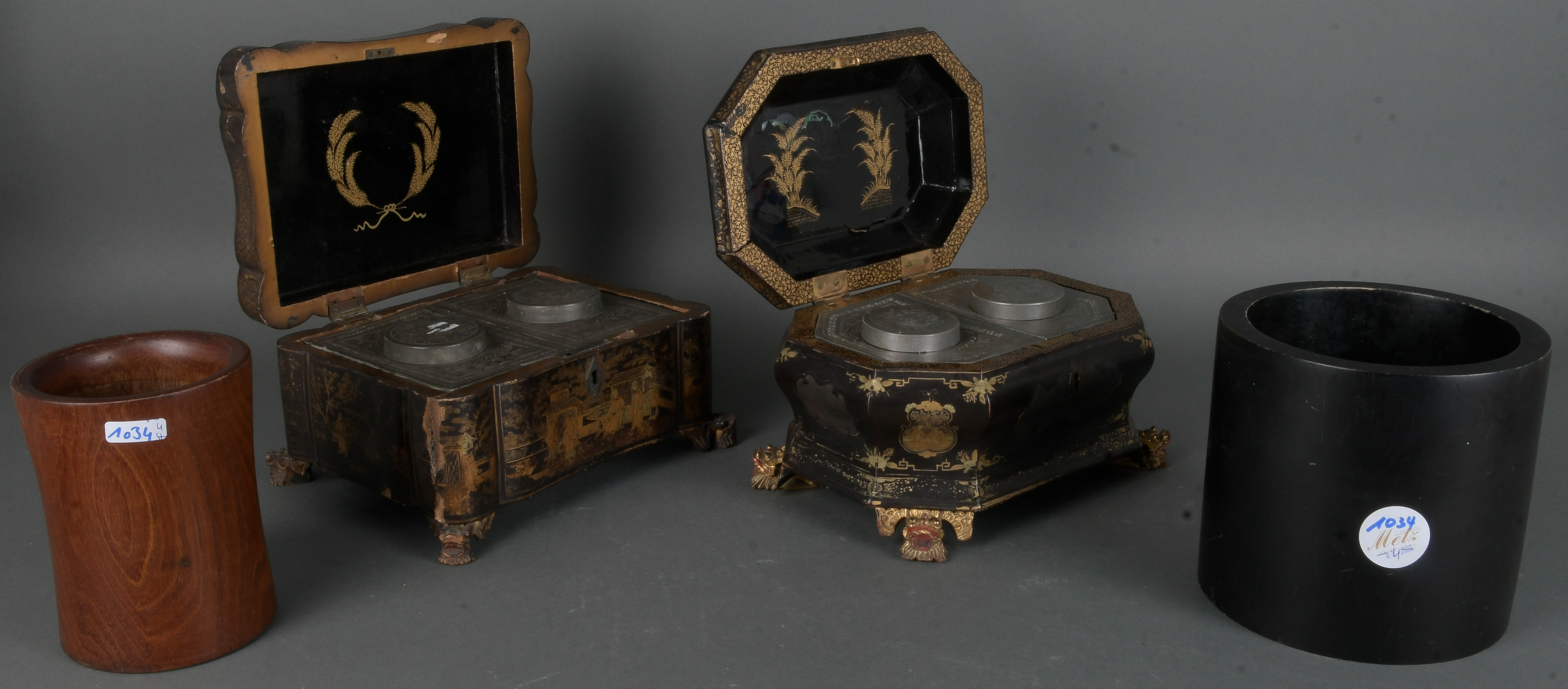 - Katalog-Nr: 1034Zwei Teekästchen. Asien. Massivholz, schwarz gelackt und gold bemalt mit figürlichen Szenen und Blattornamenten, teilw. geschnitzt, je mit ziselierten Zinneinsätzen (H=12 cm, B=23 cm, T=18 cm / H=13,5 cm, B=23 cm, T=17 cm); dazu zwei Pinselbecher (H=13,5 / 14 cm). (teilw. besch.)o.L.