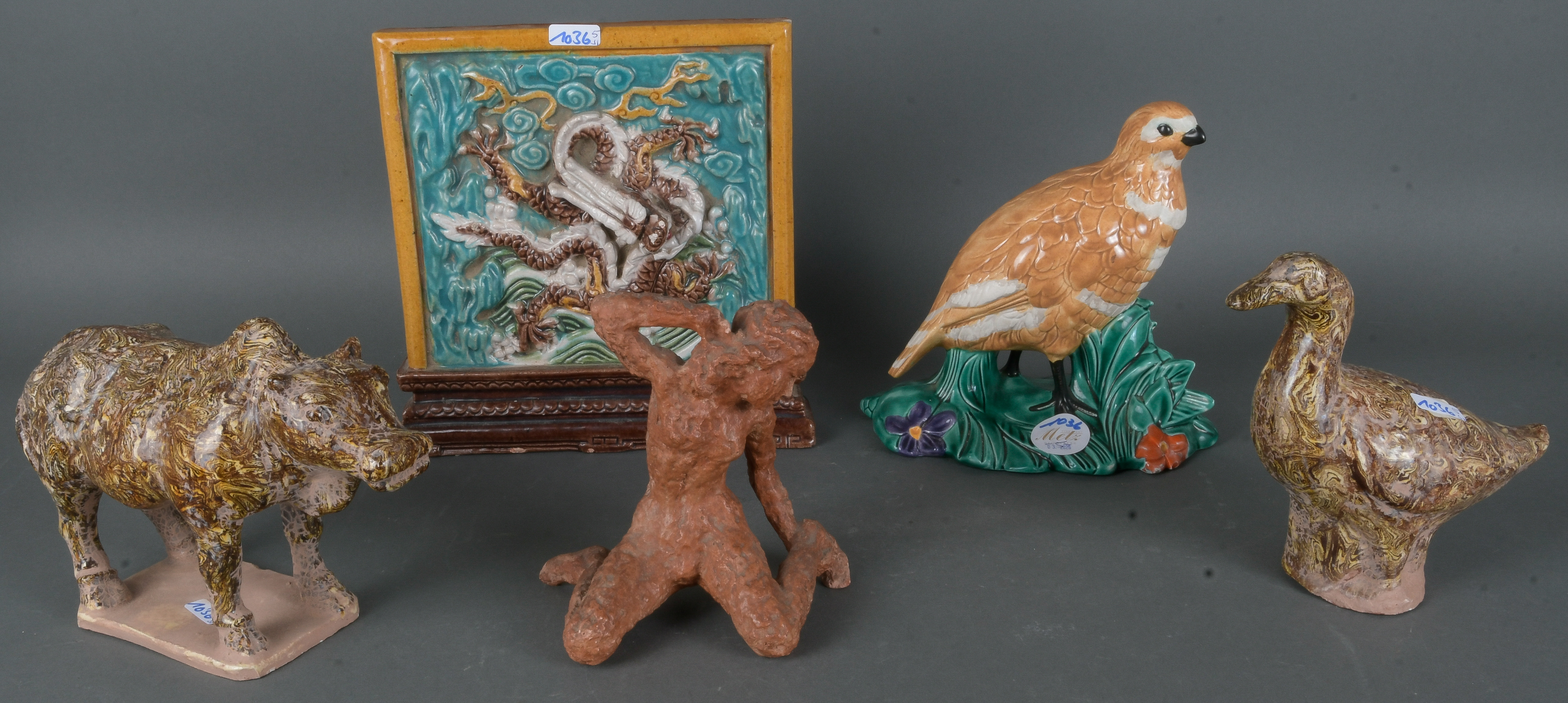- Katalog-Nr: 1036Fünftlgs. Konvolut Keramik, teilw. bunt bemalt: Büffel, Rebhuhn, monogr. „MB“, weiblicher Akt, Vogel und Zierobjekt mit Drache, H=15 bis 18,5 cm / 22 x 22 cm.o.L.