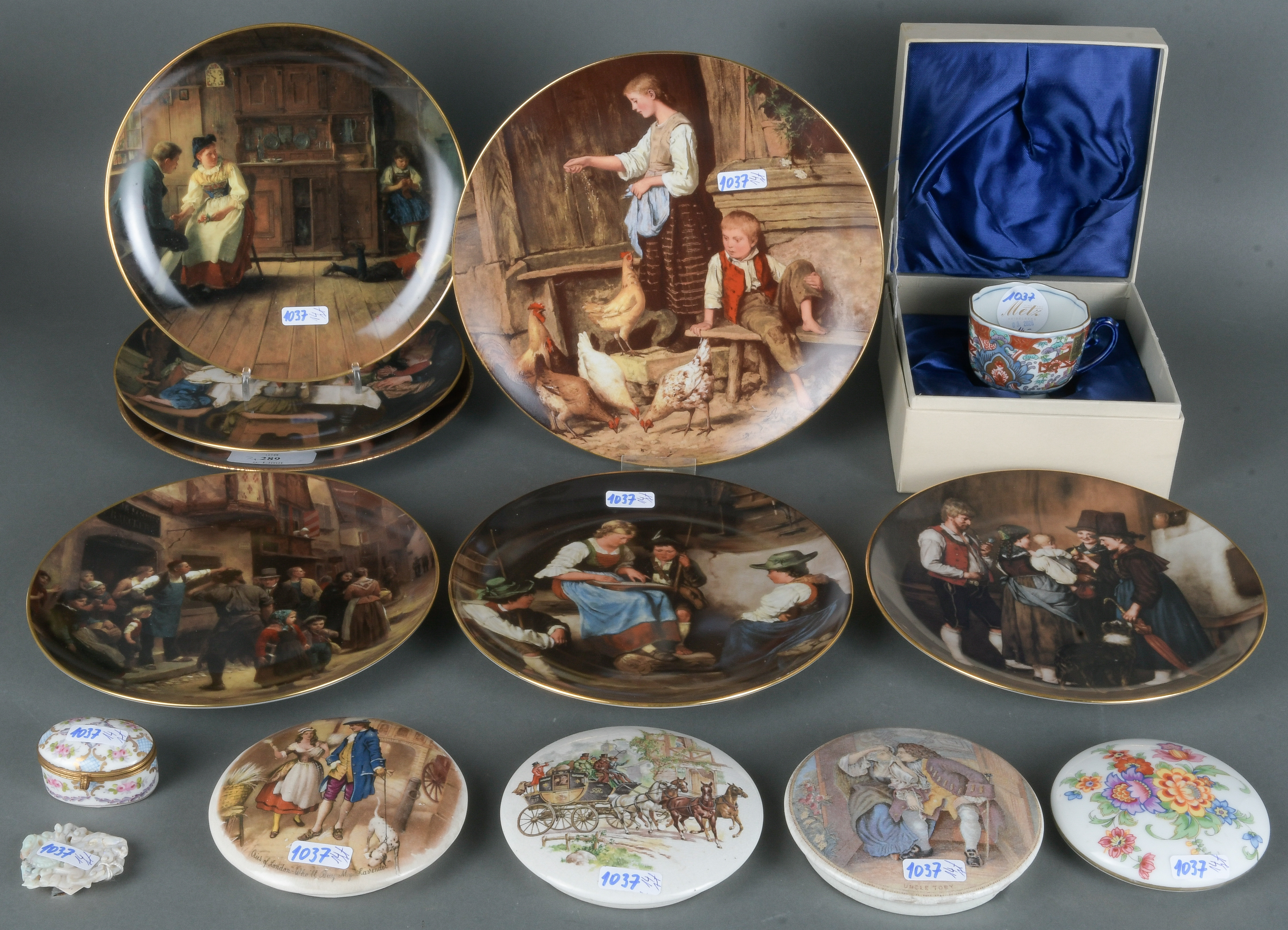 - Katalog-Nr: 1037Konvolut Porzellan. Asien / Deutsch 20. Jh. Bestehend aus: Vier Plaketten, eine Tasse, eine Tabatière, sieben Teller und ein Zierobjekt, D=10 bis 23 cm. (min. best.)o.L.