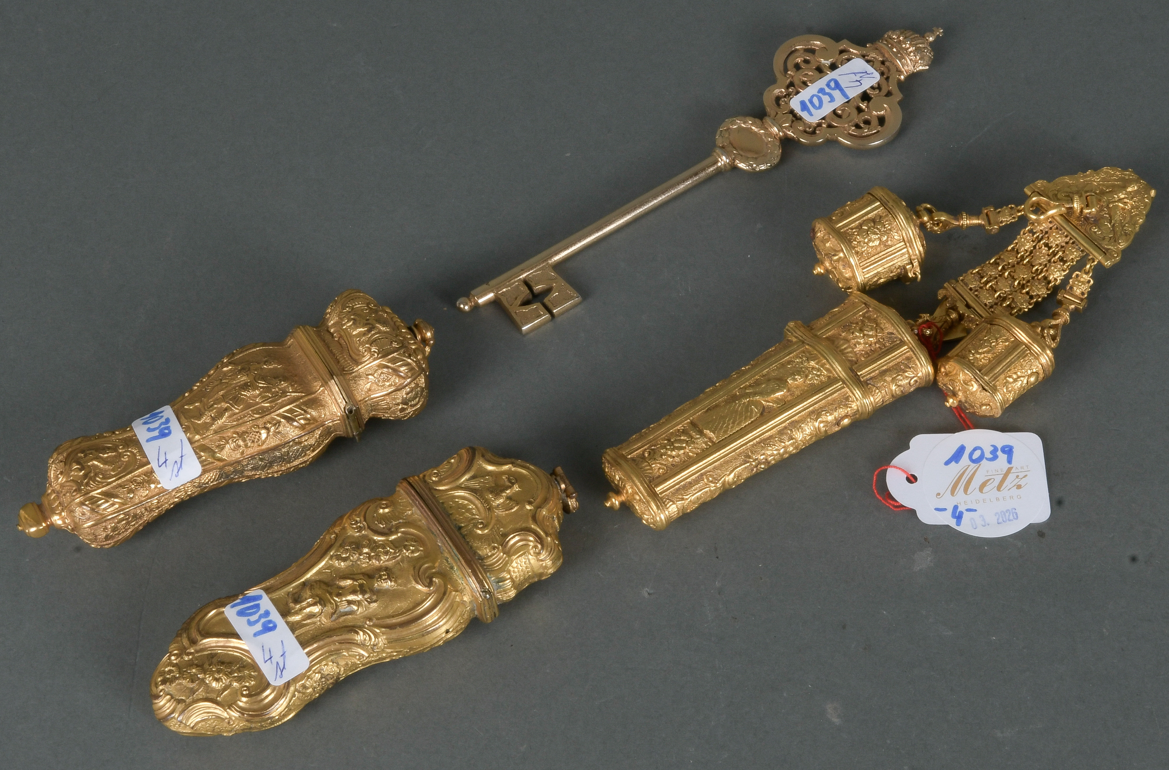 - Katalog-Nr: 1039Drei Châtelaines und ein Kammerherrenschlüssel. Deutsch 18./19. Jh. Metall vergoldet; eine mit Gürtelhaken und zwei Döschen, verziert mit romantischen Szenen, teilw. mit Inhalt, L=11 bis 15 cm.o.L.