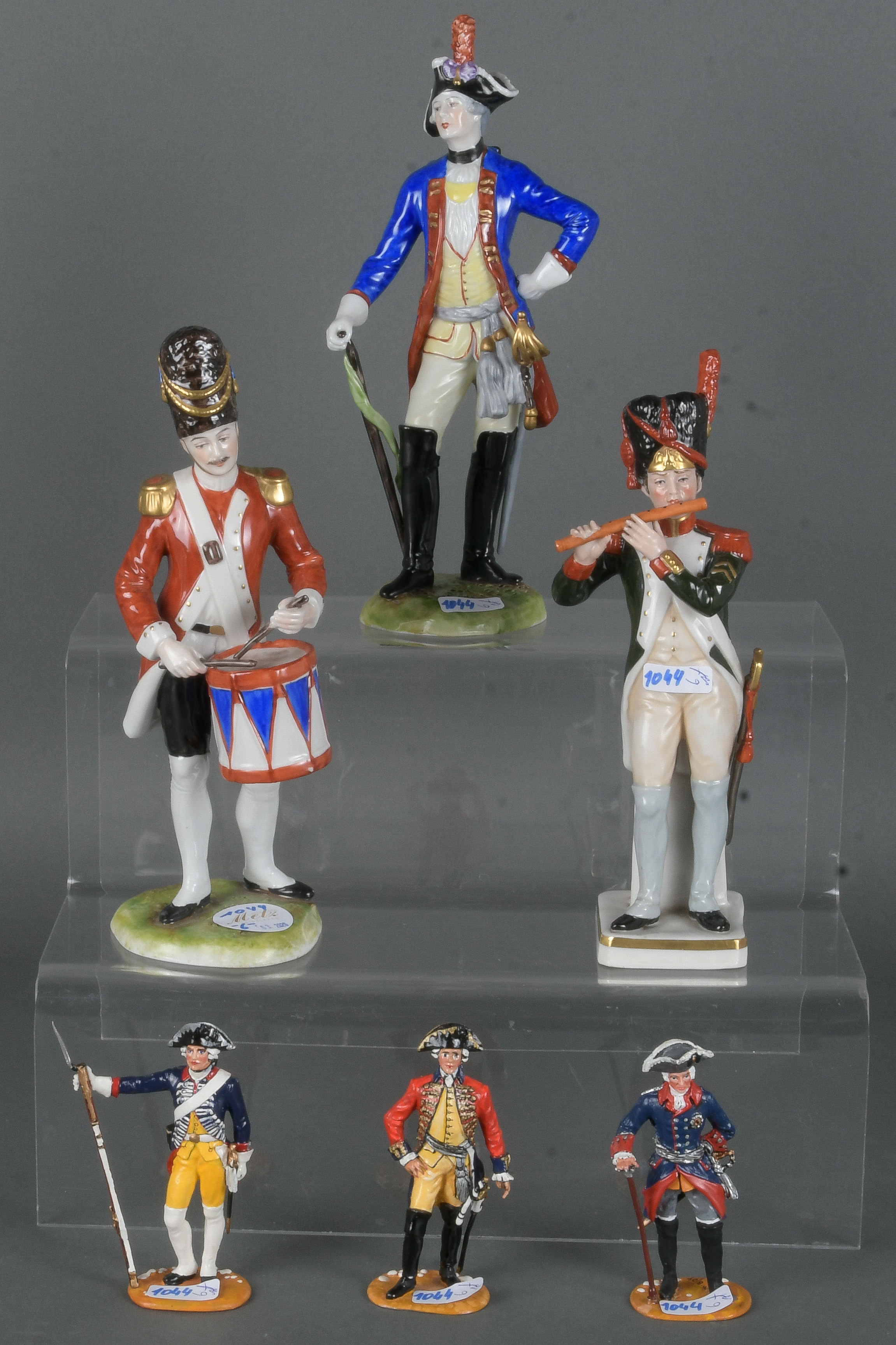 - Katalog-Nr: 1044Fünf Soldaten und Alter Fritz, u.a. Sitzendorf 20. Jh. Porzellan / Metall, bunt bemalt, H=10 bis 22 cm.o.L.