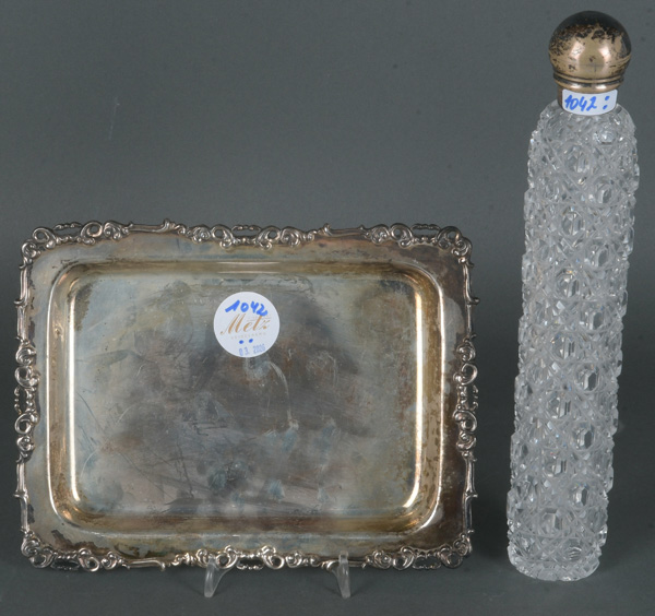 - Katalog-Nr: 1042Flakon und Tablett. Deutsch 20. Jh. 925er Silber, ca. 175 g / Glas, H=27 cm.o.L.