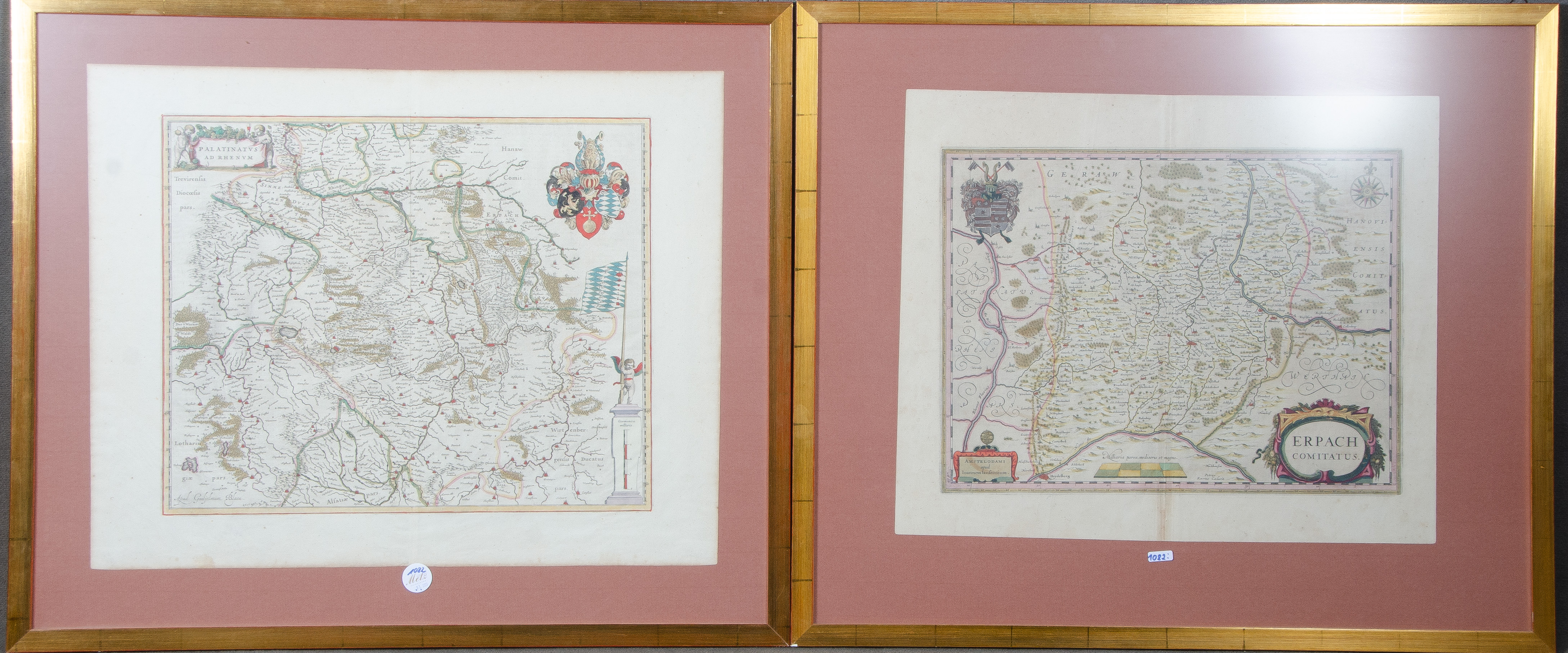 - Katalog-Nr: 1082Guiljelmus Blaeu (1600-1699). „Pfalz um 1635“, li./u./sign., re./o. kurpfälzisches Wappen in Kartusche (39,5 x 49,5 cm); dazu Johannes Janssonius (1588-1664). Karte des Odenwalds mit Erbach, li./u./sign., re./o. Wappen des Grafen von Erbach (35,5 x 47,5 cm). Zwei colorierte Kupferstiche, je hi./Gl. gerahmt.o.L.