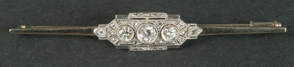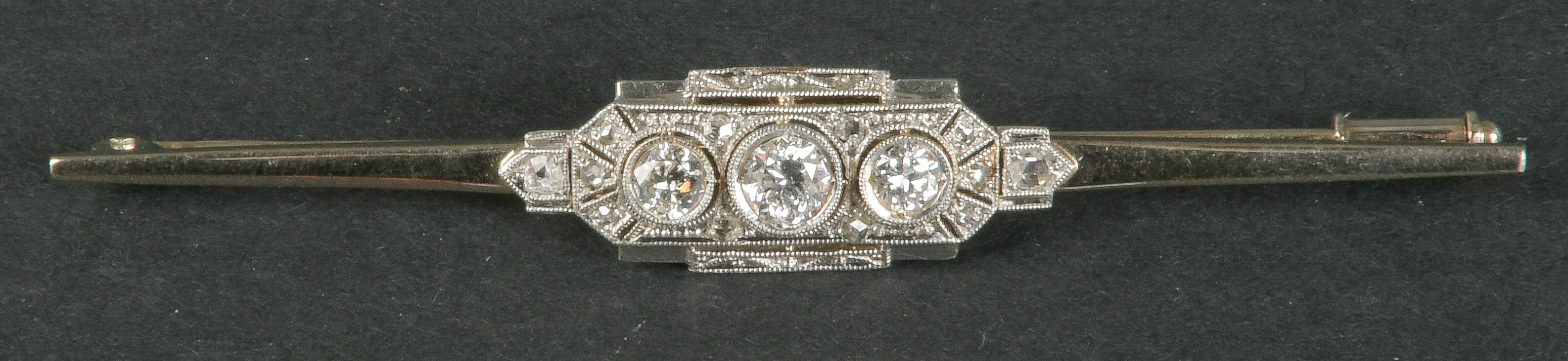 - Katalog-Nr: 1085Stabbrosche. 14 kt Gold, besetzt mit Brillanten und Diamanten, ca. 0,70 ct, Gesamtgewicht ca. 4,40 g. Die Begutachtungen der verarbeiteten Edelsteine und Diamanten wurden im gefassten Zustand vorgenommen, d.h. unter Vorbehalt einer sachgerechten Graduierung, die nur an ungefassten Steinen erfolgen kann. Dies hat zur Folge, dass die Gewichte (sog. "berechnete Gewichte", d.h. ca.+/- 10 % Abweichung) und Qualitäten (Farbe, Reinheit und Schliff) der Steine nur annähernd angegeben werden können.o.L.