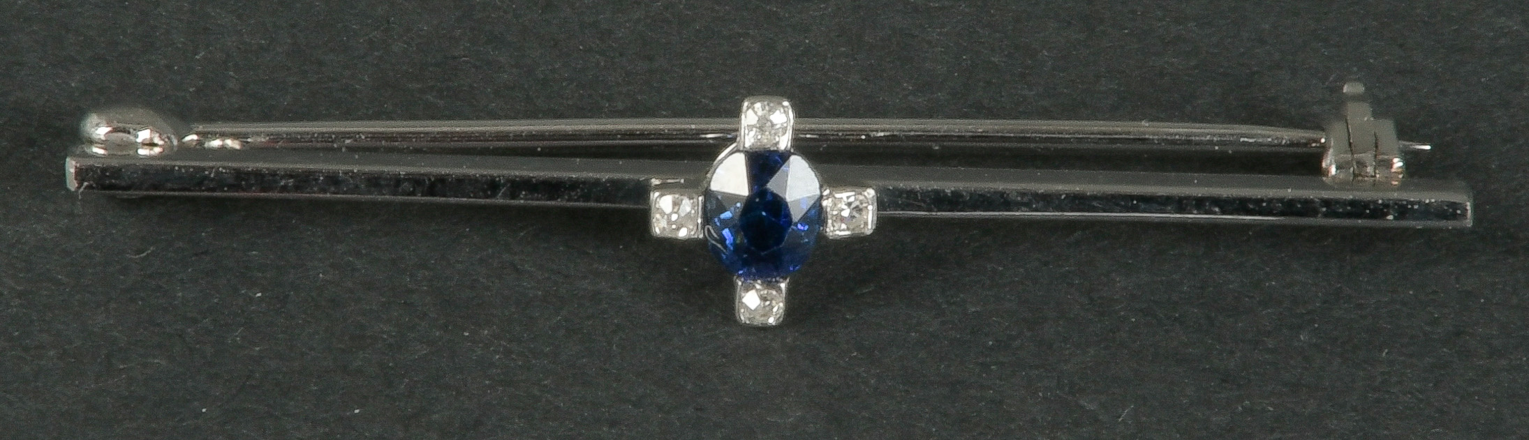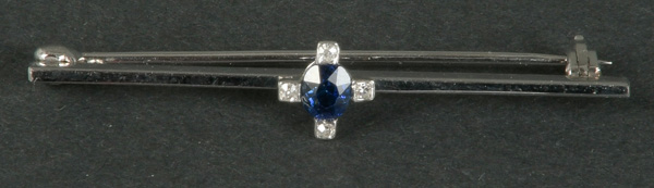 - Katalog-Nr: 1086Stabbrosche. 8 kt Gold, besetzt mit saphirfarbigem Stein und Diamant, ca. 0,01 ct, Gesamtgewicht ca. 2,1 g. Die Begutachtungen der verarbeiteten Edelsteine und Diamanten wurden im gefassten Zustand vorgenommen, d.h. unter Vorbehalt einer sachgerechten Graduierung, die nur an ungefassten Steinen erfolgen kann. Dies hat zur Folge, dass die Gewichte (sog. "berechnete Gewichte", d.h. ca.+/- 10 % Abweichung) und Qualitäten (Farbe, Reinheit und Schliff) der Steine nur annähernd angegeben werden können.o.L.