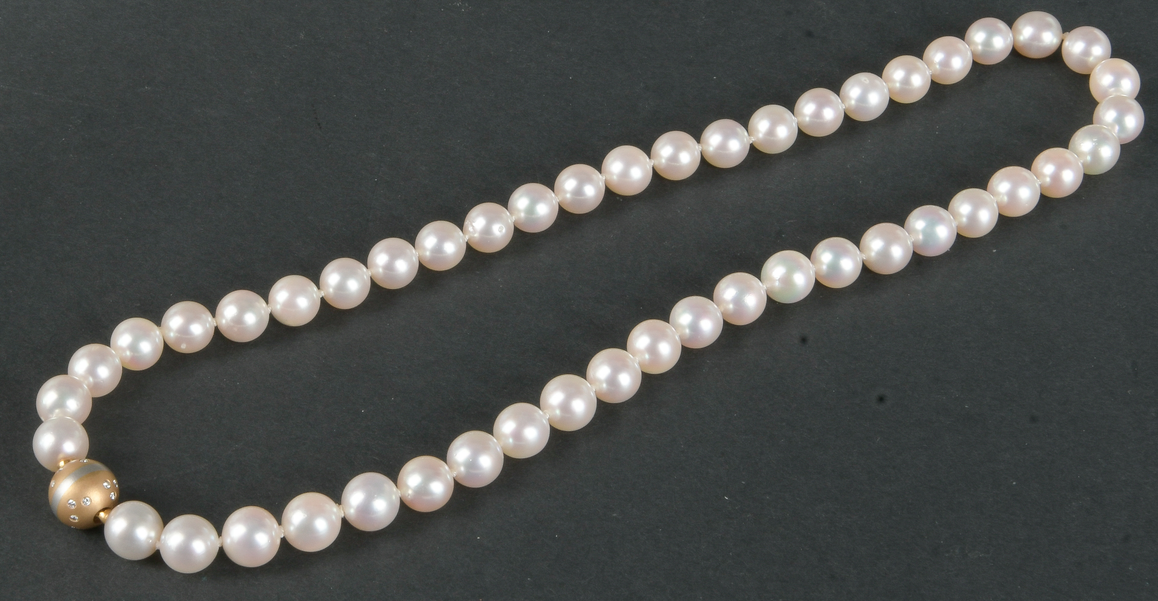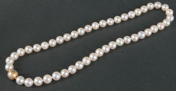 - Katalog-Nr: 1091Akoya-Perlenkette mit 18 kt Goldverschluss, besetzt mit Brillanten, ca. 0,20 ct, L=43 cm. Die Begutachtungen der verarbeiteten Edelsteine und Diamanten wurden im gefassten Zustand vorgenommen, d.h. unter Vorbehalt einer sachgerechten Graduierung, die nur an ungefassten Steinen erfolgen kann. Dies hat zur Folge, dass die Gewichte (sog. "berechnete Gewichte", d.h. ca.+/- 10 % Abweichung) und Qualitäten (Farbe, Reinheit und Schliff) der Steine nur annähernd angegeben werden können.o.L.
