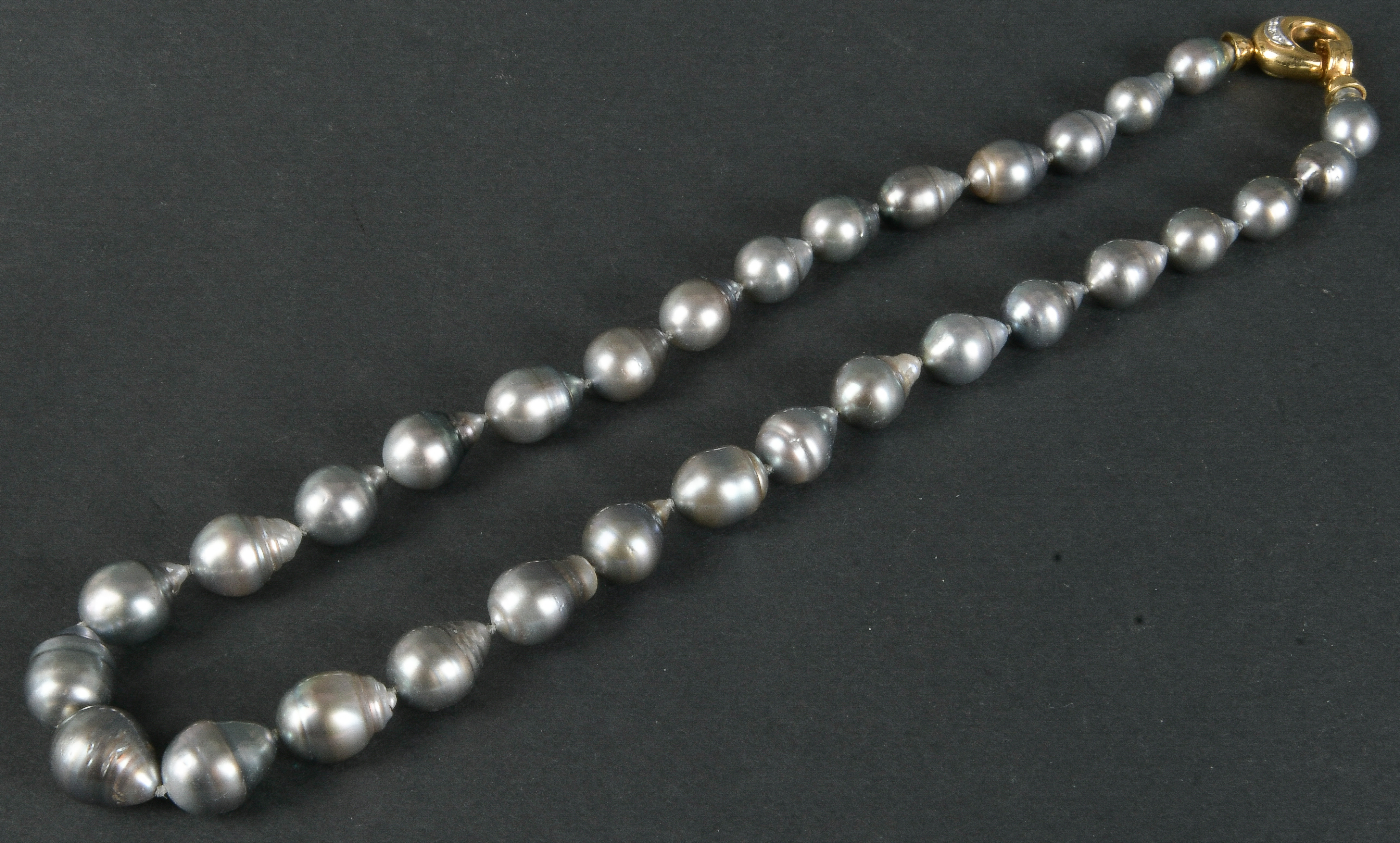 - Katalog-Nr: 1092Tahiti-Perlenkette mit 18 kt Goldverschluss, besetzt mit Brillanten, ca. 0,06 ct, L=48 cm. Die Begutachtungen der verarbeiteten Edelsteine und Diamanten wurden im gefassten Zustand vorgenommen, d.h. unter Vorbehalt einer sachgerechten Graduierung, die nur an ungefassten Steinen erfolgen kann. Dies hat zur Folge, dass die Gewichte (sog. "berechnete Gewichte", d.h. ca.+/- 10 % Abweichung) und Qualitäten (Farbe, Reinheit und Schliff) der Steine nur annähernd angegeben werden können.o.L.