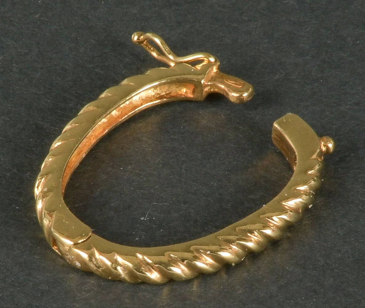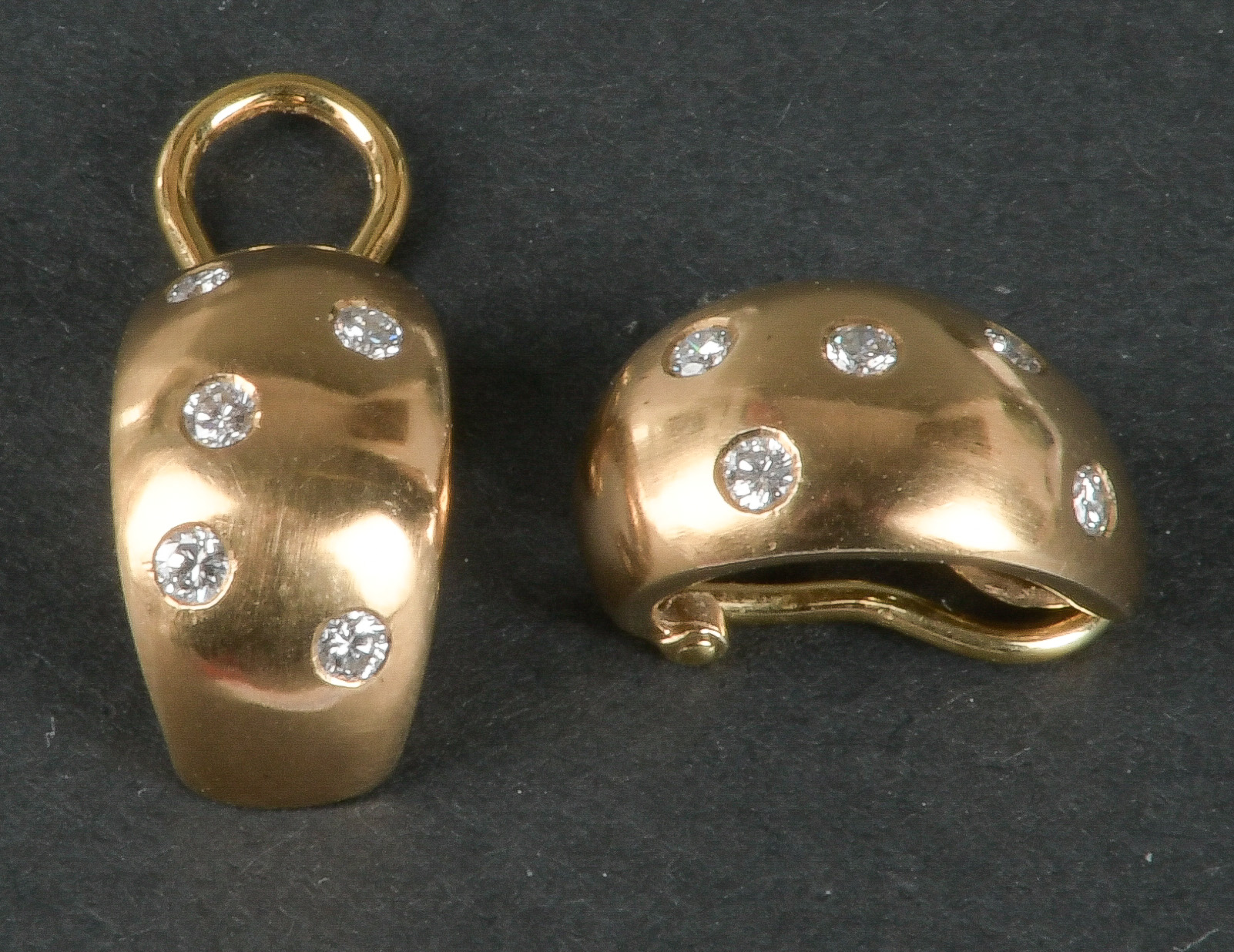 - Katalog-Nr: 1097Paar Ohrclips. 14 kt Gold, besetzt mit Brillanten, ca. 0,30 ct, Gesamtgewicht ca. 6,5 g. Die Begutachtungen der verarbeiteten Edelsteine und Diamanten wurden im gefassten Zustand vorgenommen, d.h. unter Vorbehalt einer sachgerechten Graduierung, die nur an ungefassten Steinen erfolgen kann. Dies hat zur Folge, dass die Gewichte (sog. "berechnete Gewichte", d.h. ca.+/- 10 % Abweichung) und Qualitäten (Farbe, Reinheit und Schliff) der Steine nur annähernd angegeben werden können.o.L.