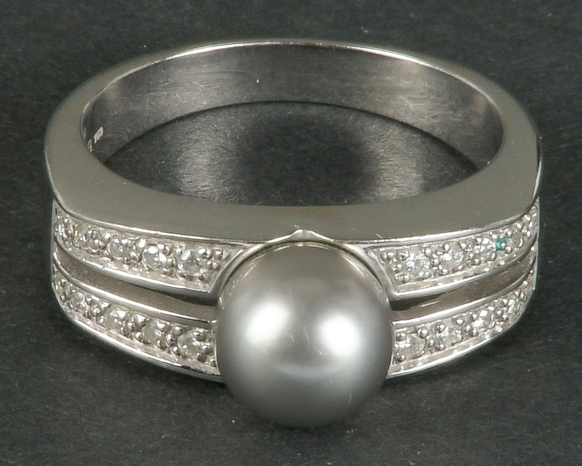 - Katalog-Nr: 1093Damenring. 18 kt Gold, besetzt mit Zuchtperle und Brillanten, ca. 0,23 ct, Gesamtgewicht ca. 7,2 g, Ringgröße 59. Die Begutachtungen der verarbeiteten Edelsteine und Diamanten wurden im gefassten Zustand vorgenommen, d.h. unter Vorbehalt einer sachgerechten Graduierung, die nur an ungefassten Steinen erfolgen kann. Dies hat zur Folge, dass die Gewichte (sog. "berechnete Gewichte", d.h. ca.+/- 10 % Abweichung) und Qualitäten (Farbe, Reinheit und Schliff) der Steine nur annähernd angegeben werden können.o.L.