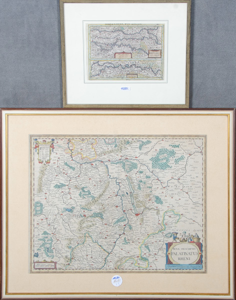 - Katalog-Nr: 1080Johannes Janssonius (1588-1664). Karte der Rheinpfalz, re./u./sign. in Wappenkartusche (38 x 48 cm); dazu Graphiker des 17./18. Jhs. nach Johannes Janssonius. Karte der Wasserläufe von Rhein, Waal und Maas (16 x 20 cm). Zwei colorierte Kupferstiche, je mit Passepartout hi./Gl. gerahmt.o.L.