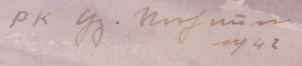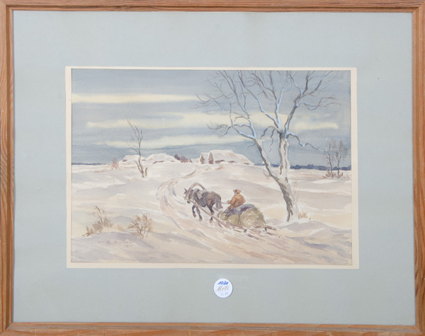 - Katalog-Nr: 1081Maler des 20. Jhs. Winterlandschaft mit Schlitten. Aquarell/Papier, li./u. unleserlich sign./dat. 1942, mit Passepartout hi./Gl. gerahmt, 31 x 45 cm.o.L.
