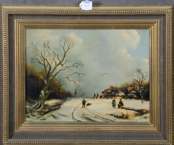 - Katalog-Nr: 1084Maler des 19./20. Jhs. Winterlandschaft mit Personenstaffage und Gebäuden. Öl/Lw., gerahmt, 30,5 x 40 cm.o.L.