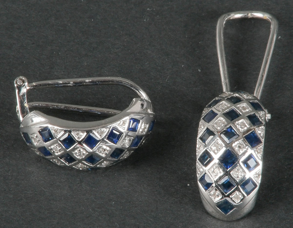 - Katalog-Nr: 1094Paar Ohrclips. 18 kt Gold, besetzt mit Saphir und Diamanten, ca. 0,20 ct, Gesamtgewicht, ca. 7,0 g. Die Begutachtungen der verarbeiteten Edelsteine und Diamanten wurden im gefassten Zustand vorgenommen, d.h. unter Vorbehalt einer sachgerechten Graduierung, die nur an ungefassten Steinen erfolgen kann. Dies hat zur Folge, dass die Gewichte (sog. "berechnete Gewichte", d.h. ca.+/- 10 % Abweichung) und Qualitäten (Farbe, Reinheit und Schliff) der Steine nur annähernd angegeben werden können.o.L.