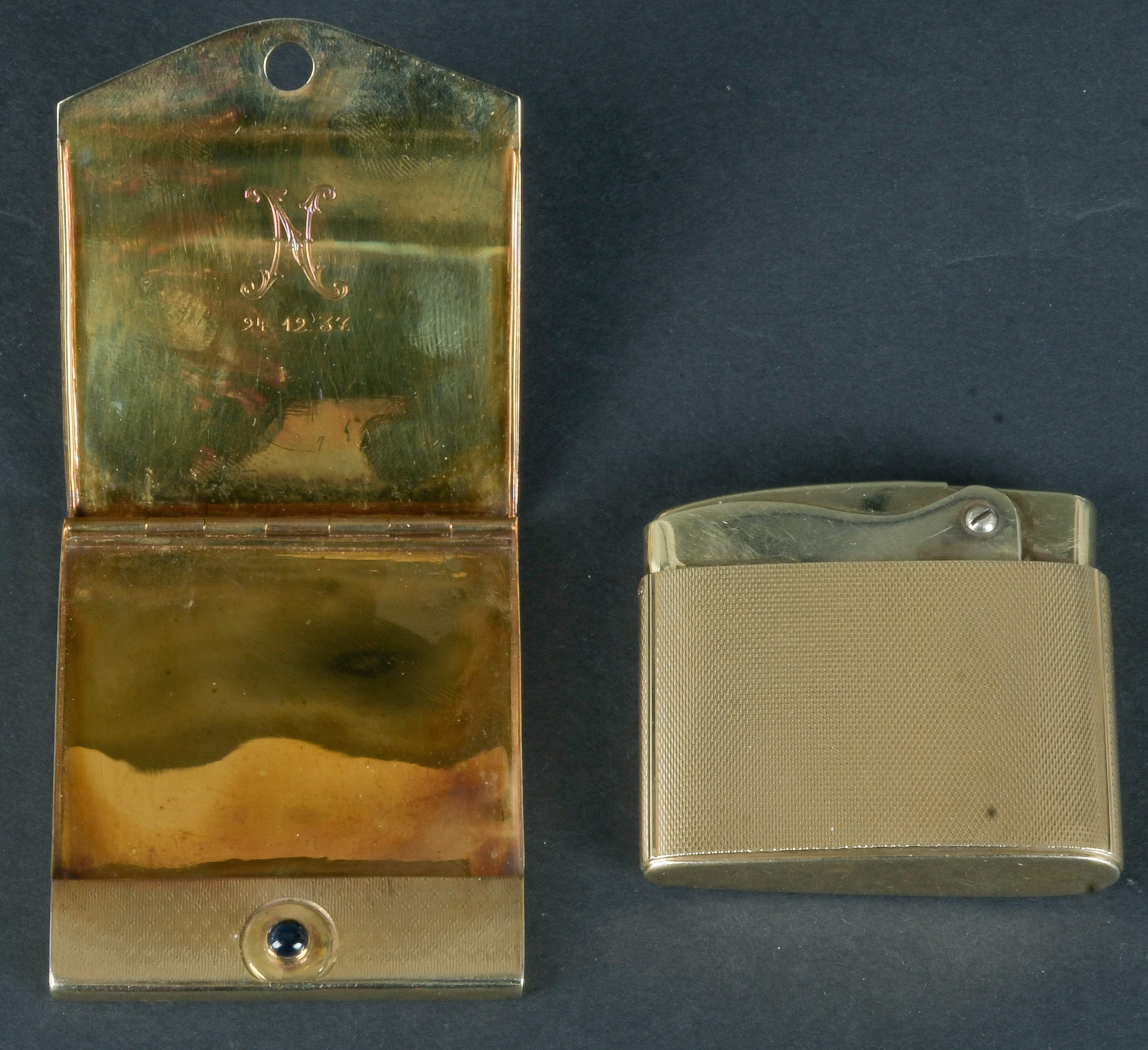 - Katalog-Nr: 1152Feuerzeug-Ummantelung und Streichholz-Etui. 14 kt Gold, besetzt mit Saphircabochon, Gesamtgewicht ca. 34 g.o.L.