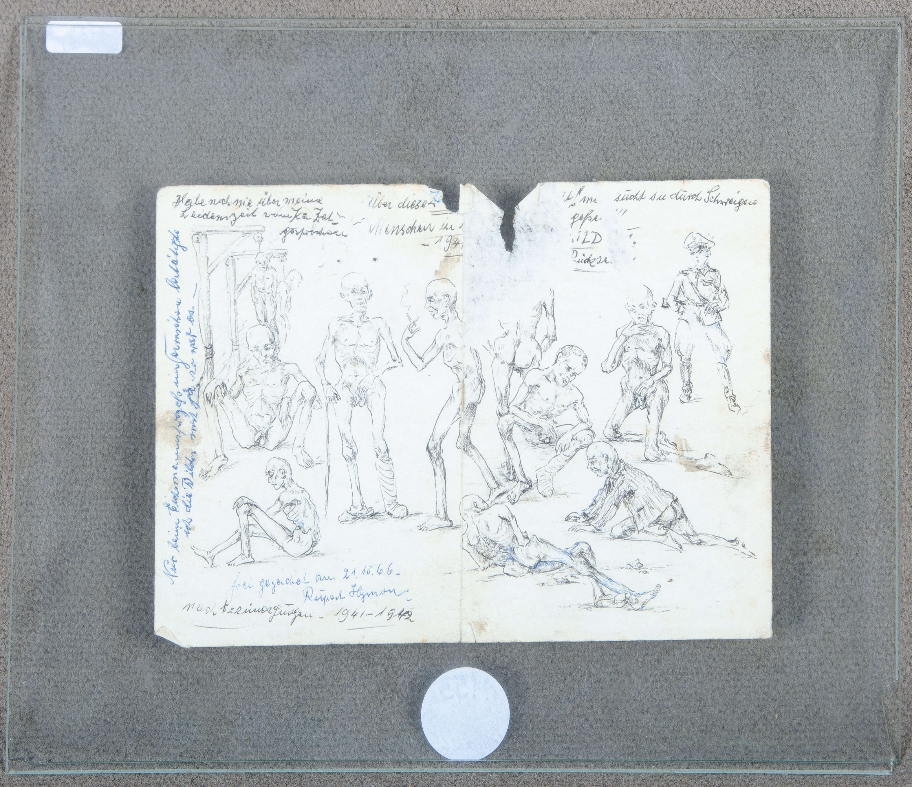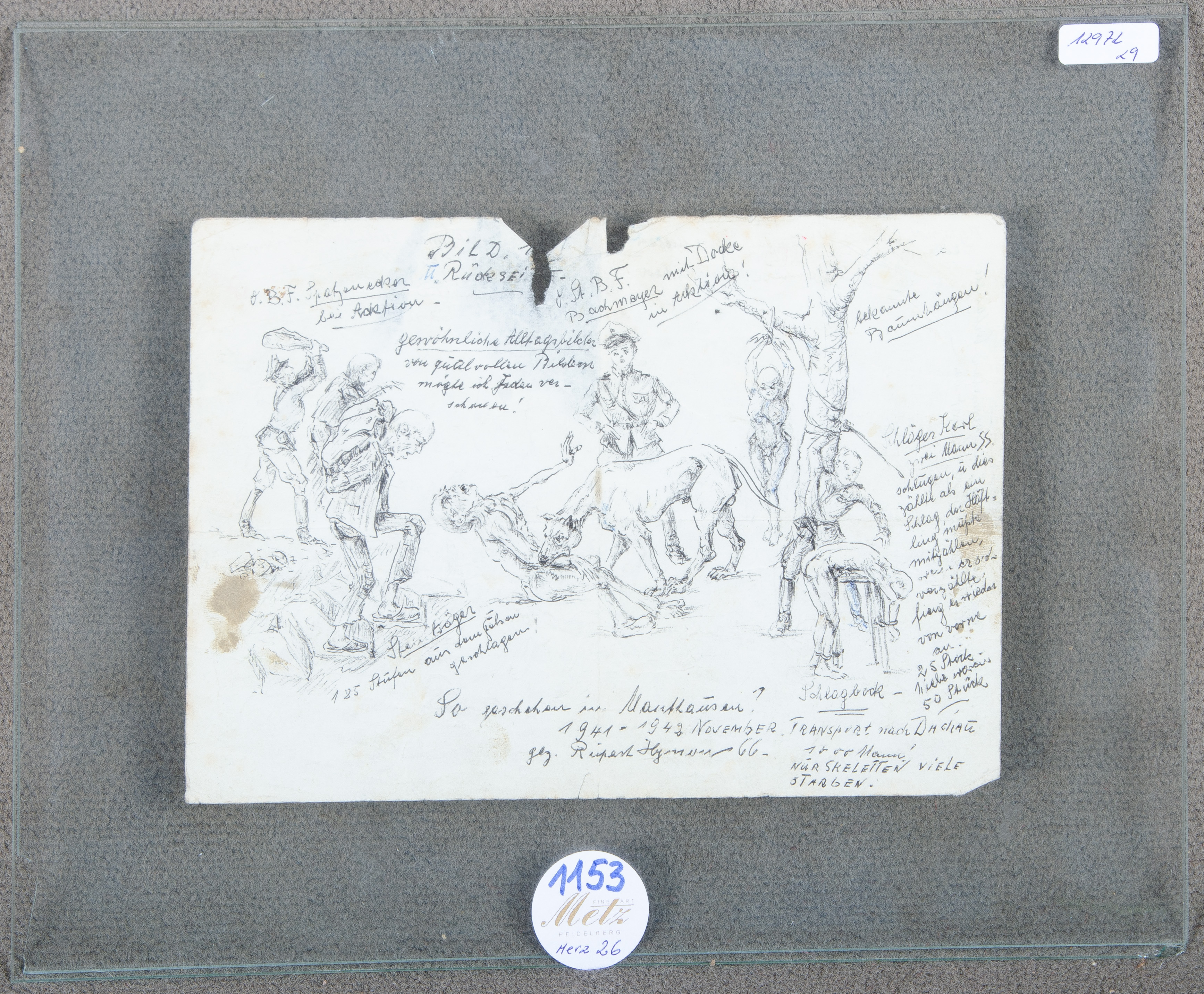 - Katalog-Nr: 1153Rupert Hymon (1872-?). „Menschen in Mauthausen“, sign./dat. (19)66, u./mittig/bez., verso beschrieben, hi./Gl. gerahmt (14,7 x 21 cm). Rupert Hymon wurde am 20. März 1897 in Ludwigshafen geboren und war Gärtner, bevor er am 06. Dezember 1941 nach Mauthausen deportiert und am 8. November 1942 nach Dachau überstellt wurde. Bereits als Strafgefangener beim Bunker- und Barackenbau hatte er Skizzen angefertigt. Vor Erstellung des hier präsentierten Werkes, hat er wie auf der Vorderseite beschrieben, nie über seine Erlebnisse im KZ gesprochen. Das beidseitig bemalte und beschriebene Werk zeigt Szenen aus dem KZ Mauthausen mitsamt Beschreibungen, die zur strafrechtlichen Verfolgung der national-sozialistischen Verbrechen im Adolf- Eichmann-Prozess in Jerusalem angefertigt und verwendet wurden. Das Werk ist eines seiner sogenannten Ego-Dokumente, bei welchen Überlebende ihre Erfahrungen in Konzentrationslagern dokumentierten.o.L.