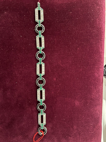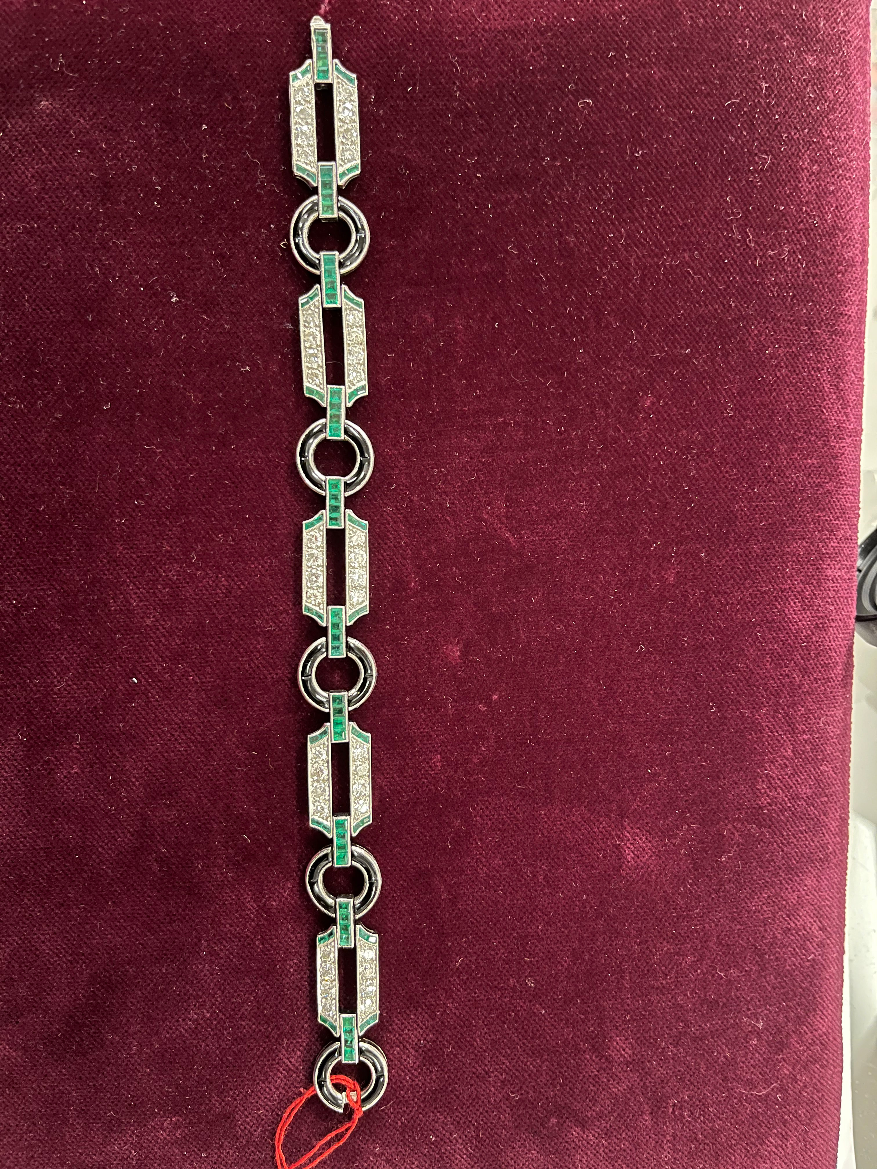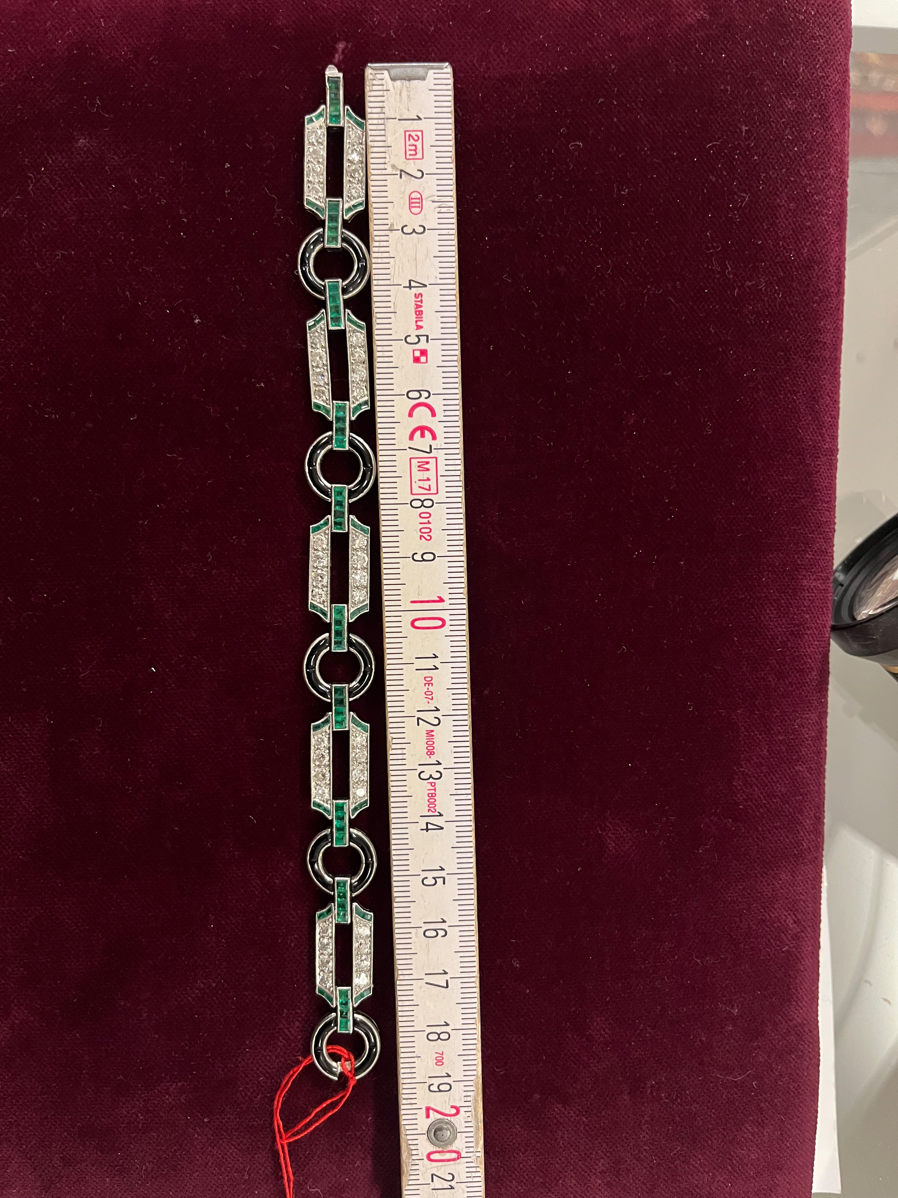 - Katalog-Nr: 1158Gliederarmband. Platin, besetzt mit Brillanten, ca. 4,0 ct, und Smaragden, teilw. emailliert, Gesamtgewicht ca. 24,6 cm, L=19 cm. Die Begutachtungen der verarbeiteten Edelsteine und Diamanten wurden im gefassten Zustand vorgenommen, d.h. unter Vorbehalt einer sachgerechten Graduierung, die nur an ungefassten Steinen erfolgen kann. Dies hat zur Folge, dass die Gewichte (sog. "berechnete Gewichte", d.h. ca.+/- 10 % Abweichung) und Qualitäten (Farbe, Reinheit und Schliff) der Steine nur annähernd angegeben werden können.o.L.