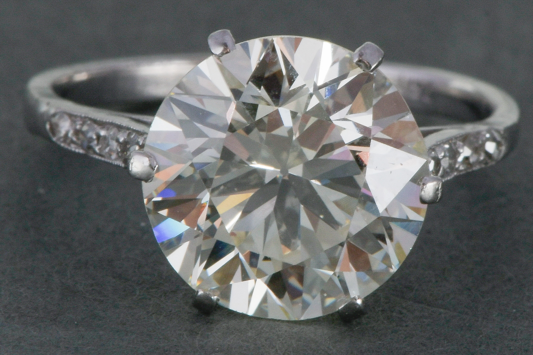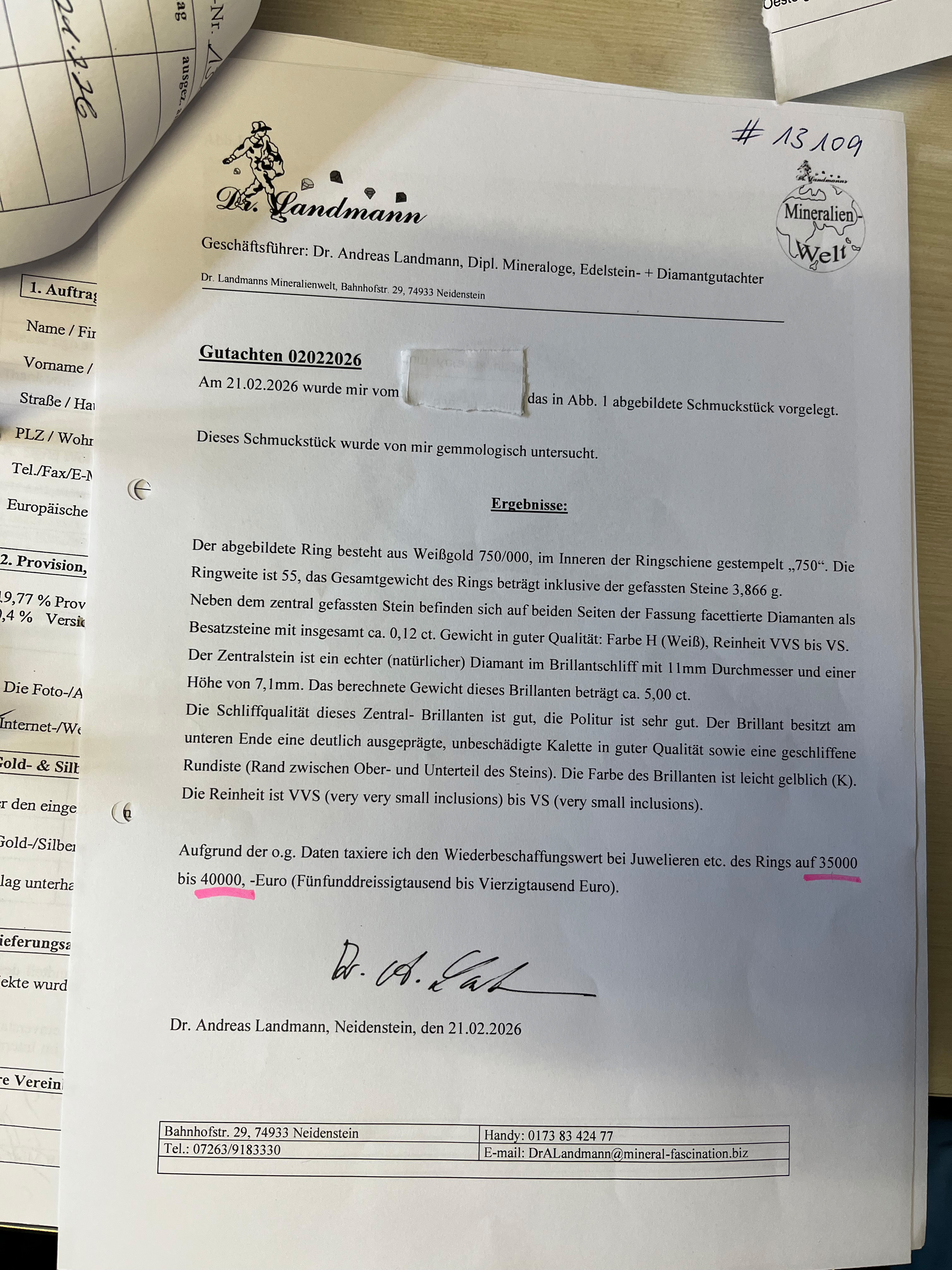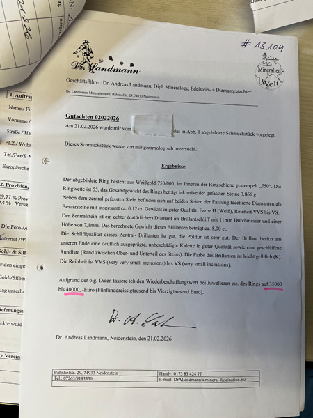 - Katalog-Nr: 1161Solitärring. 18 kt Gold, besetzt mit Brillant, ca. 5,5 ct, Gesamtgewicht ca. 3,8 g, Ringgröße 55. Gemmologisches Gutachten von Dr. Andreas Landmann, Neidenstein 21.02.2026, mit Zeitwertangabe über EUR 35.000,00 bis 40.000,00 liegt vor und kann für EUR 120,00 erworben werden. Die Begutachtungen der verarbeiteten Edelsteine und Diamanten wurden im gefassten Zustand vorgenommen, d.h. unter Vorbehalt einer sachgerechten Graduierung, die nur an ungefassten Steinen erfolgen kann. Dies hat zur Folge, dass die Gewichte (sog. "berechnete Gewichte", d.h. ca.+/- 10 % Abweichung) und Qualitäten (Farbe, Reinheit und Schliff) der Steine nur annähernd angegeben werden können.o.L.