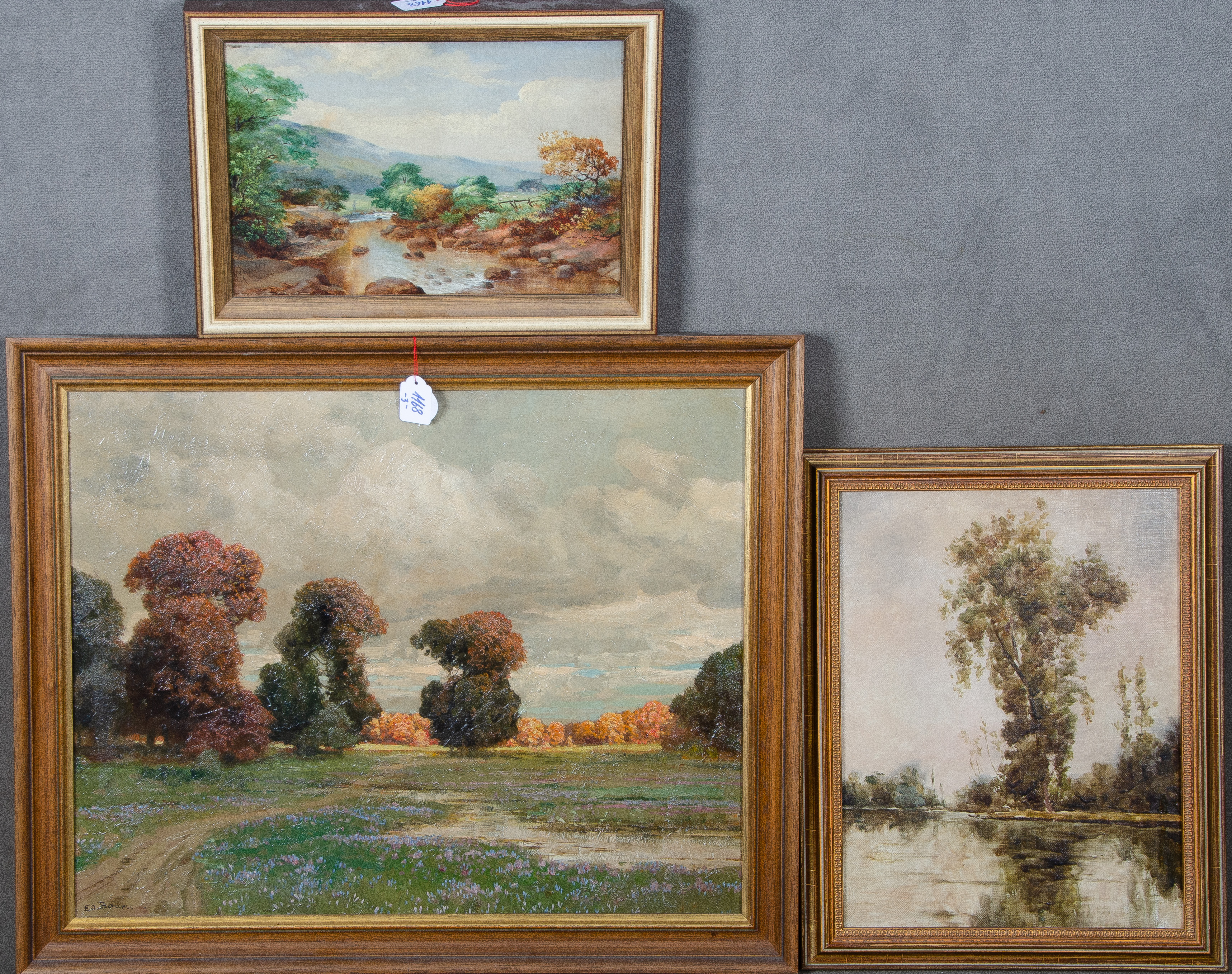 - Katalog-Nr: 1168Dreitlgs. Konvolut Gemälde: Eberhard Baum (Maler des 19./20. Jhs.). Waldlichtung. Öl/Holz, li./u./sign. (42,5 x 53 cm); Maler des 20. Jhs. Seelandschaft. Öl/Lw.; G. Wright (Maler des 19. Jhs.). Flusslandschaft mit Tieren, li./u./sign./dat. 1879 (20,5 x 30,5 cm / rest.). Je gerahmt.o.L.
