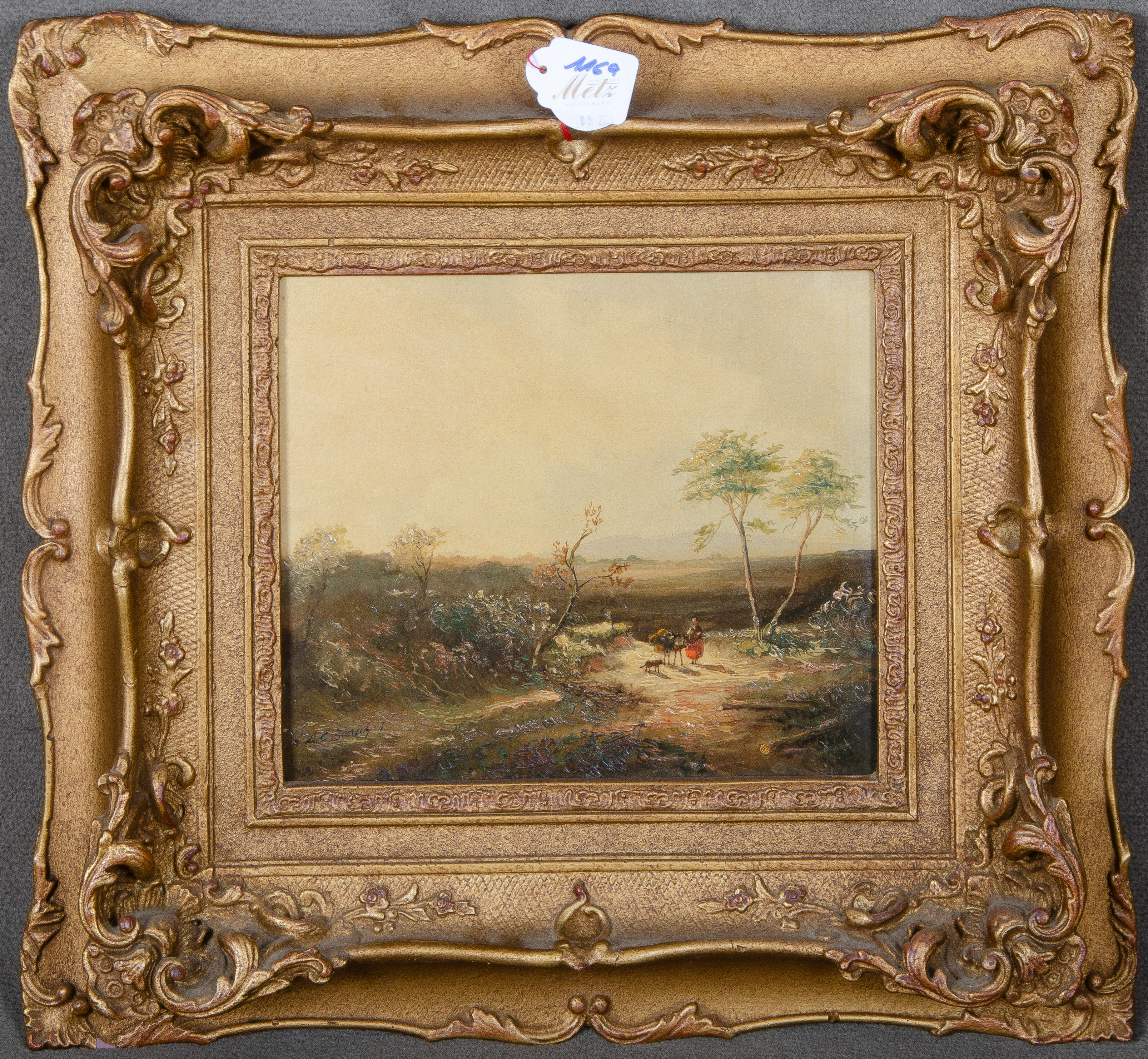 - Katalog-Nr: 1169Ferdinand Carl Sierig (1839-1905). Landschaft mit weiblicher Figur und Tieren auf Weg. Öl/Holz, li./u./sign., gerahmt, 20 x 22 cm.o.L.