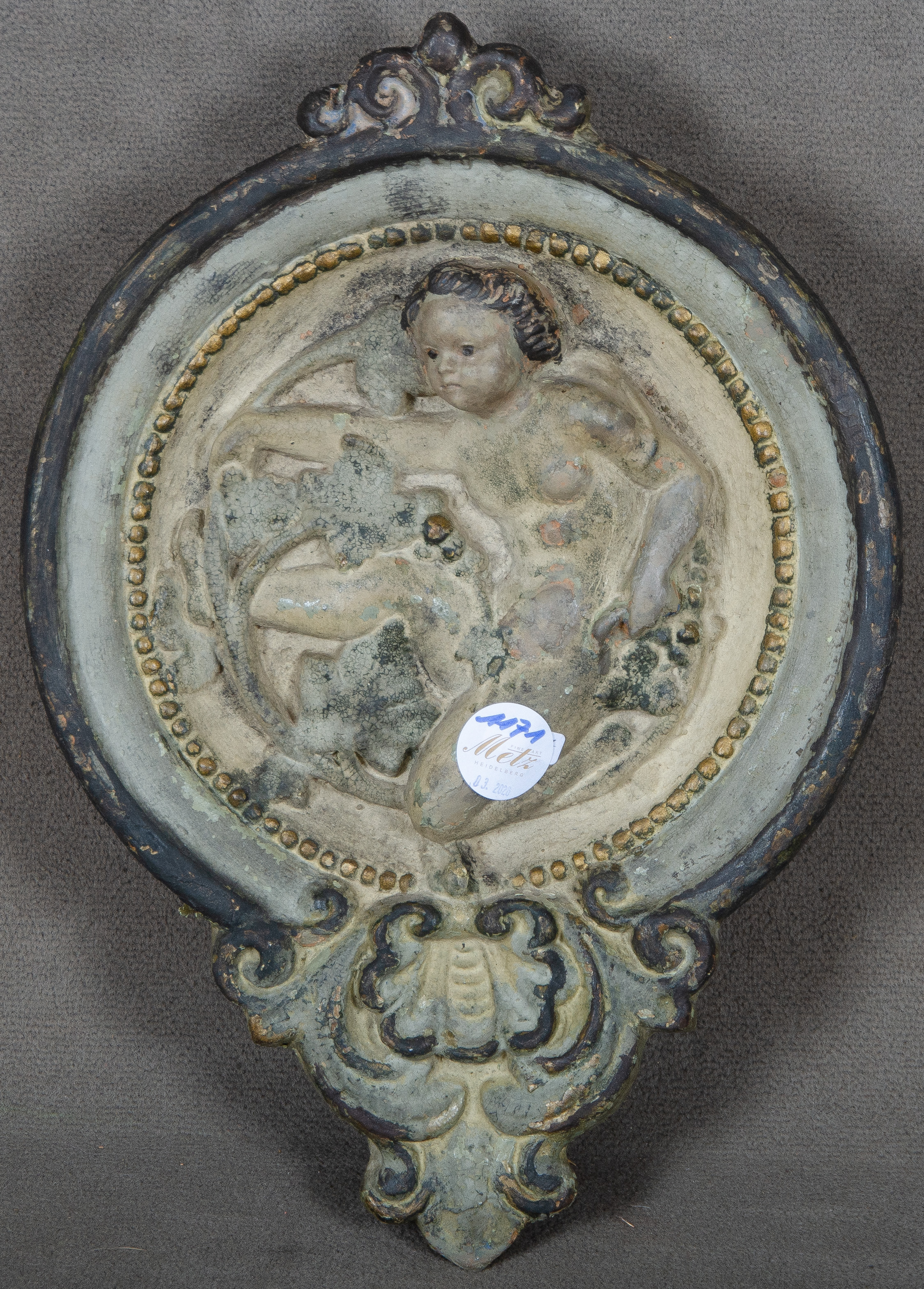 - Katalog-Nr: 1171Historismus-Ofenplatte. Deutsch 19. Jh. Ton, reliefeirt mit Putto, Blätter-, Muschel-, Trauben- und Rocailledekor sowie Resten alter Bemalung, 38 x 26 cm.o.L.