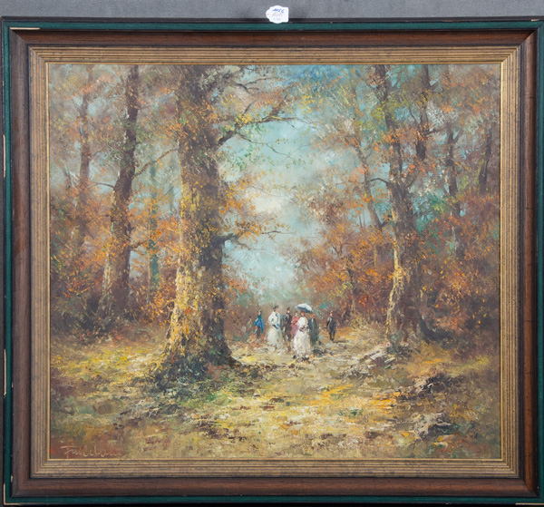 - Katalog-Nr: 1156Maler des 20. Jhs. Waldspaziergang. Öl/Lw., li./u. unleserlich sign., gerahmt, 70 x 80 cm.o.L.