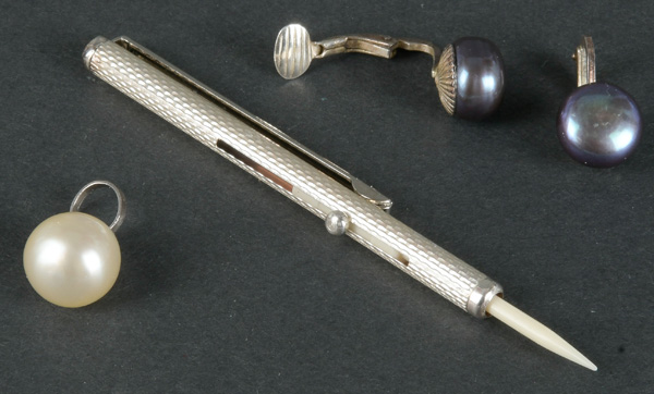 - Katalog-Nr: 1162Anhänger, Ohrclips und Zahnstocher. Zwei Teile Silber, ca. 6,7 g, besetzt mit Perlen.o.L.