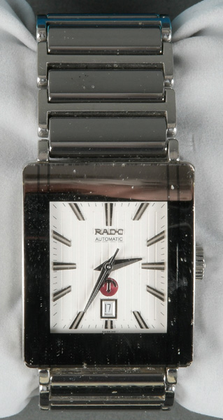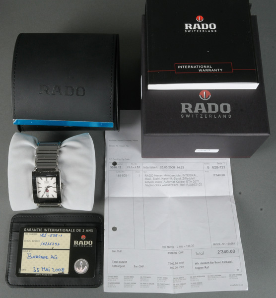 - Katalog-Nr: 1166Herrenarmbanduhr „Rado“, Automatic. Edelstahl / Keramik, in Box mit Papieren. Rechnung von Bucherer vom 25.05.2008 über CHF 2.340,00 liegt vor. (Funktion ungeprüft)o.L.
