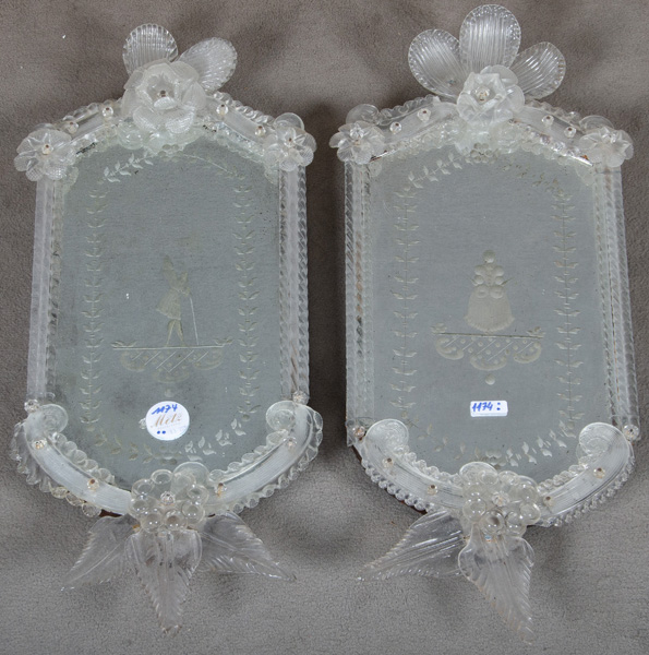 - Katalog-Nr: 1174Paar kleine Wandspiegel. Italien um 1900. Farbloses Glas, teilw. geschliffen, mit aufgeschmolzenen Blüten, Blättern, Rocaillen, gedrehten Stäben und galantem Paar, je 51 x 22,5 cm.o.L.