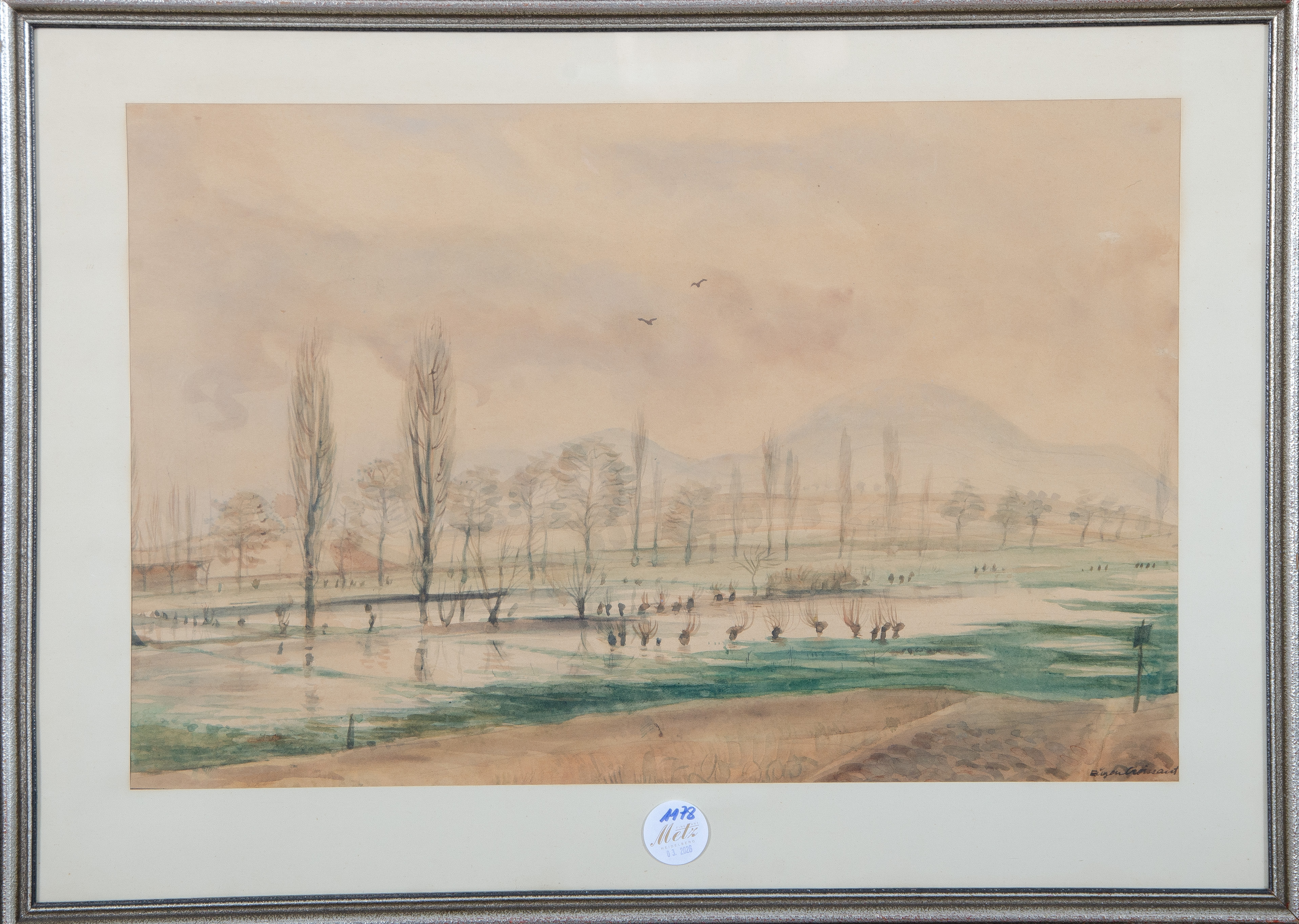 - Katalog-Nr: 1178Eugen Croissant (1898-1976). Überflutete Landschaft mit Bäumen. Aquarell/Papier, re./u./sign., mit Passepartout hi./Gl. gerahmt, 32 x 48 cm.o.L.