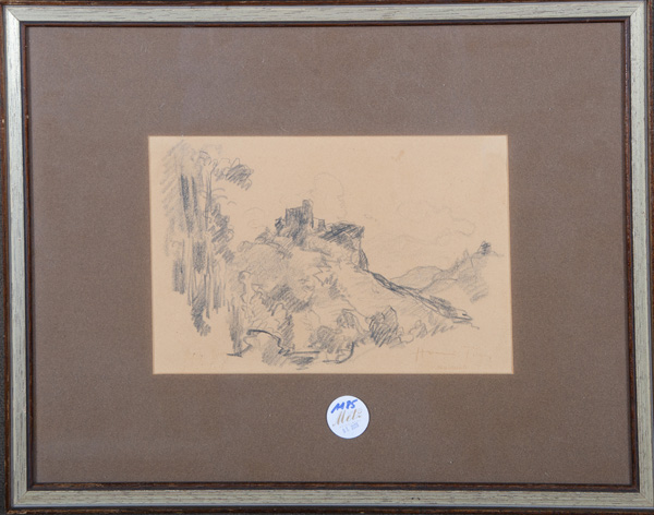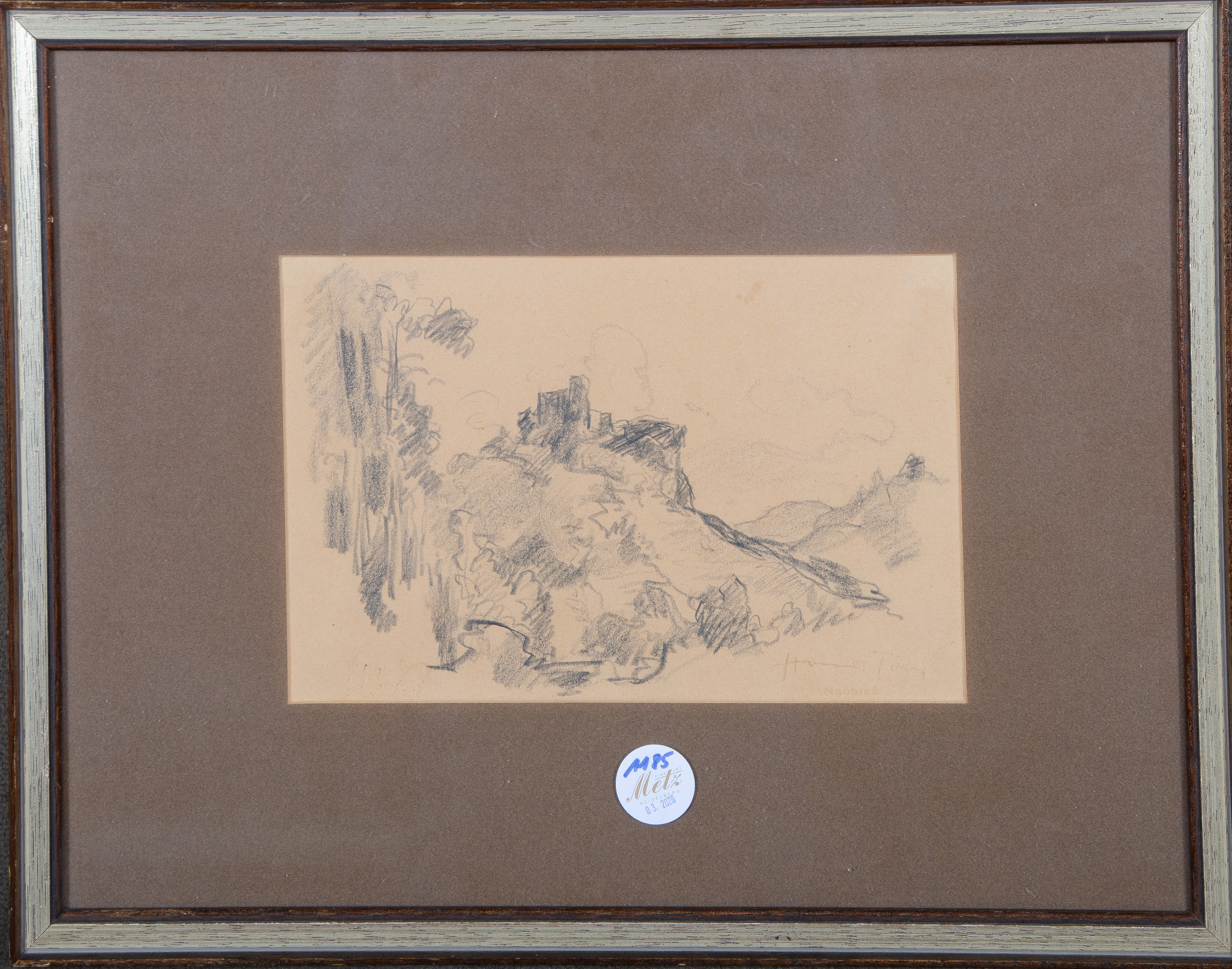 - Katalog-Nr: 1185Hanns Fay (1888-1957). Ansicht des Hambacher Schlosses. Bleistiftzeichnung, re./u./sign., mit Passepartout hi./Gl. gerahmt, 16,5 x 25,5 cm.o.L.