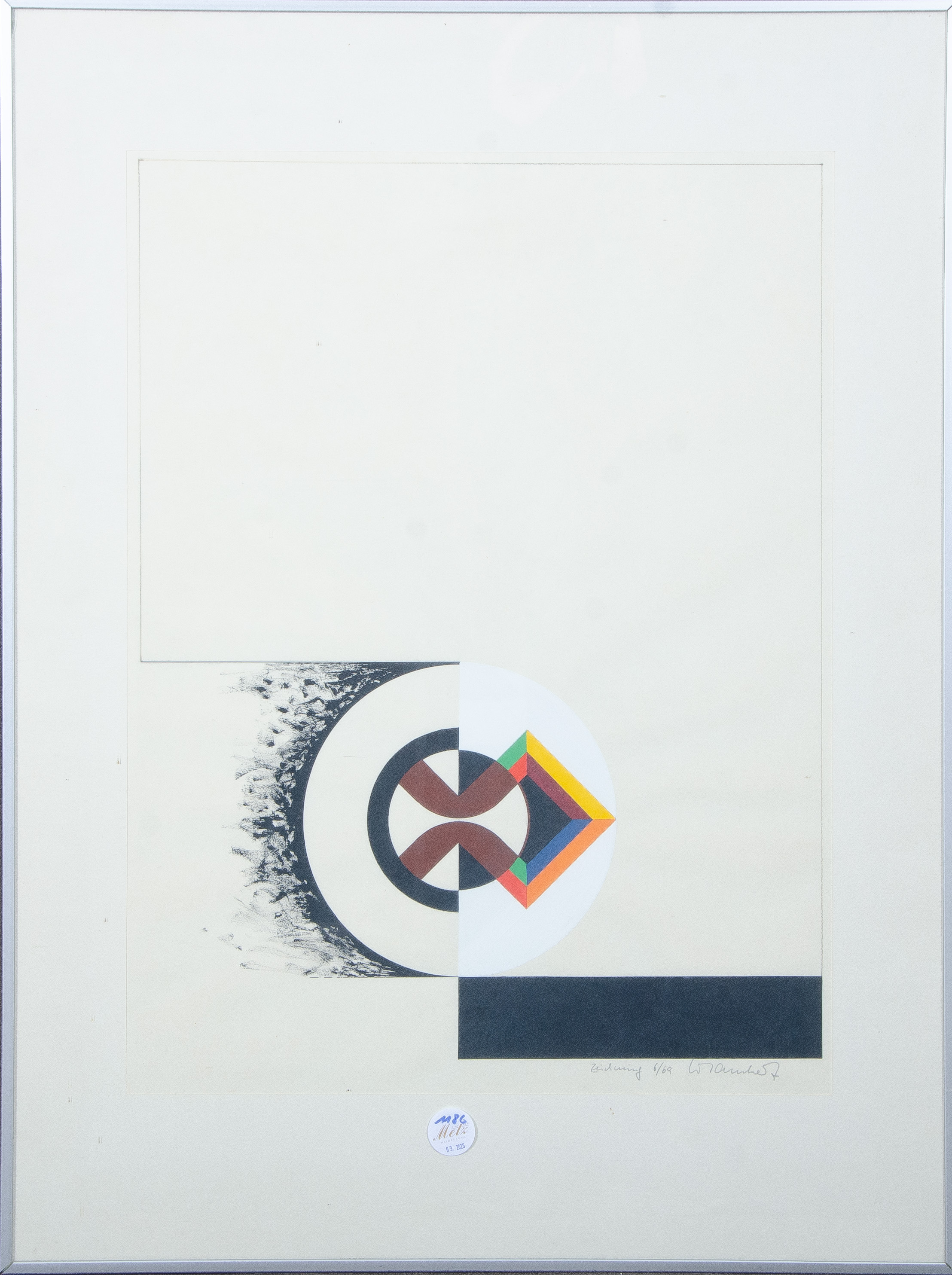 - Katalog-Nr: 1186Graphiker des 20. Jhs. Geometrische Formen. Farblithographie 6/69, re./u. unleserlich sign./dat. (19)57, mit Passepartout hi./Gl. gerahmt, 59 x 43 cm.o.L.