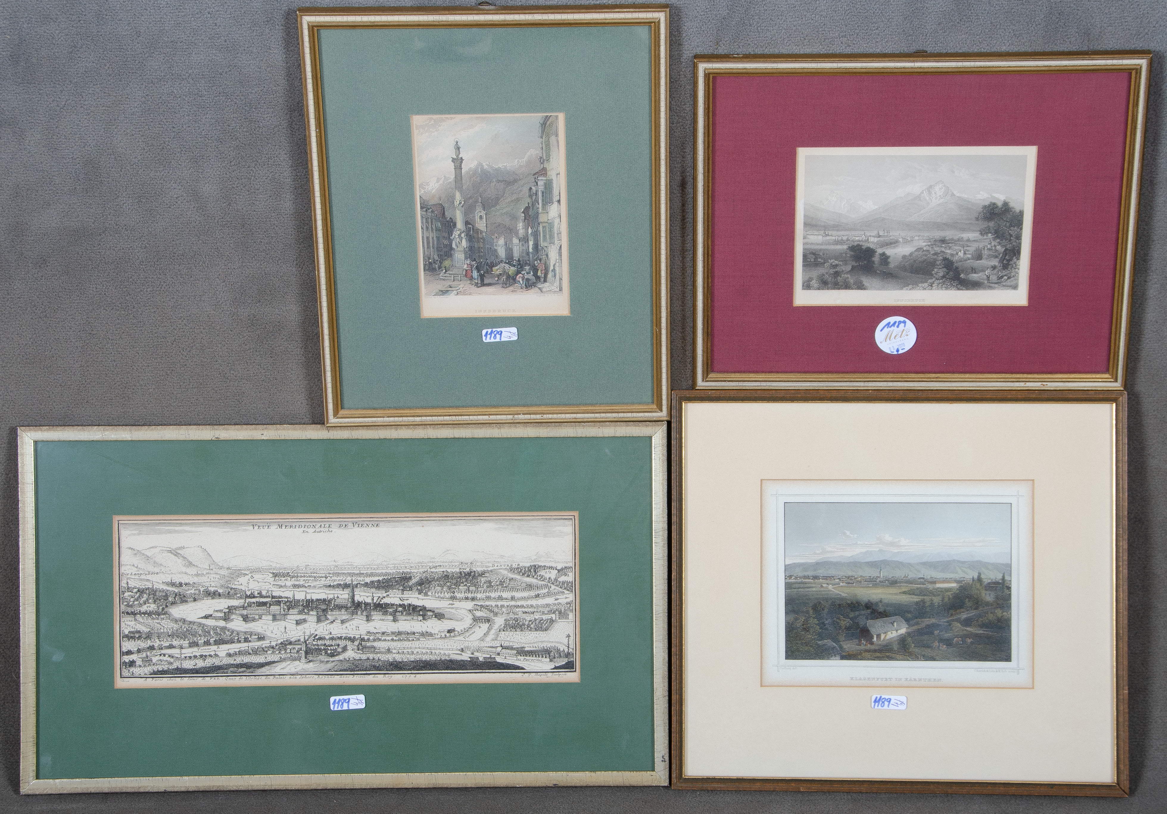 - Katalog-Nr: 1189L. G. Begule / C. Stanfield (Graphiker des 18./19. Jhs.) u.a. Ansichten von Innsbruck, Klagenfurt und Wien. Kupfer- / Stahlstiche, teilw. coloriert, mit Passepartout hi./Gl. gerahmt, 11,5 x 33 bis 13,5 x 10 cm.o.L.
