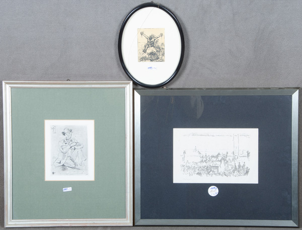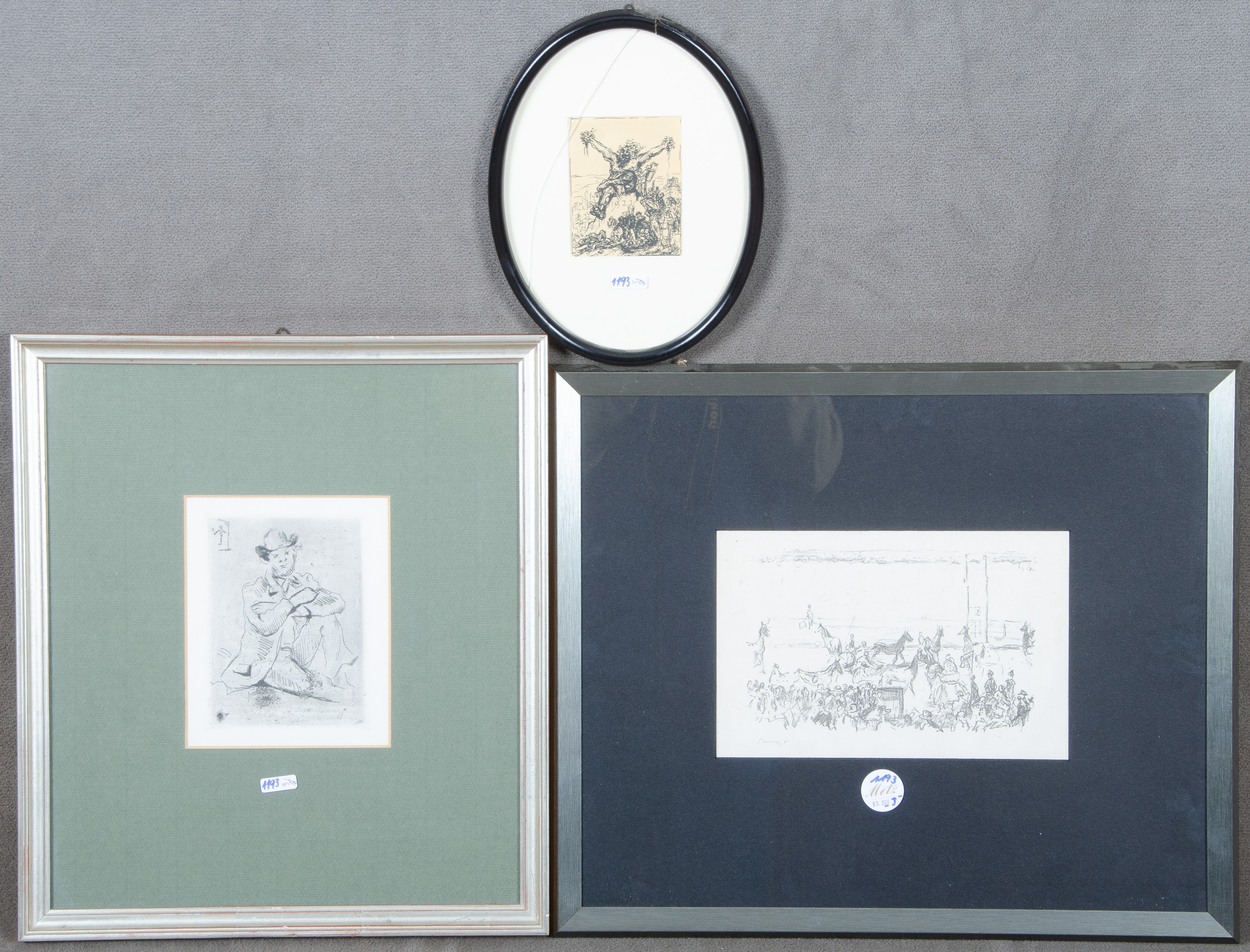 - Katalog-Nr: 1193Max Slevogt (1868-1932) u.a. Porträt eines sitzenden Mannes, Bacchus und Pferderennen. Radierung / zwei Lithographien, eine li./u./sign./dat. 1921, je mit Passepartout hi./Gl. gerahmt, 10 x 8 bis 17 x 24,5 cm.o.L.
