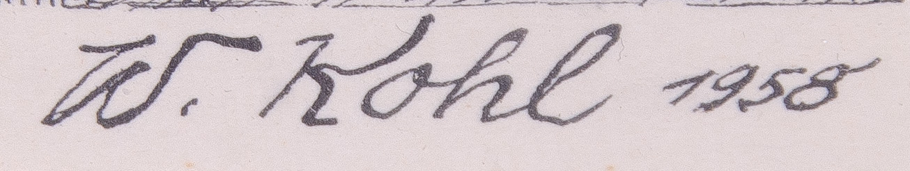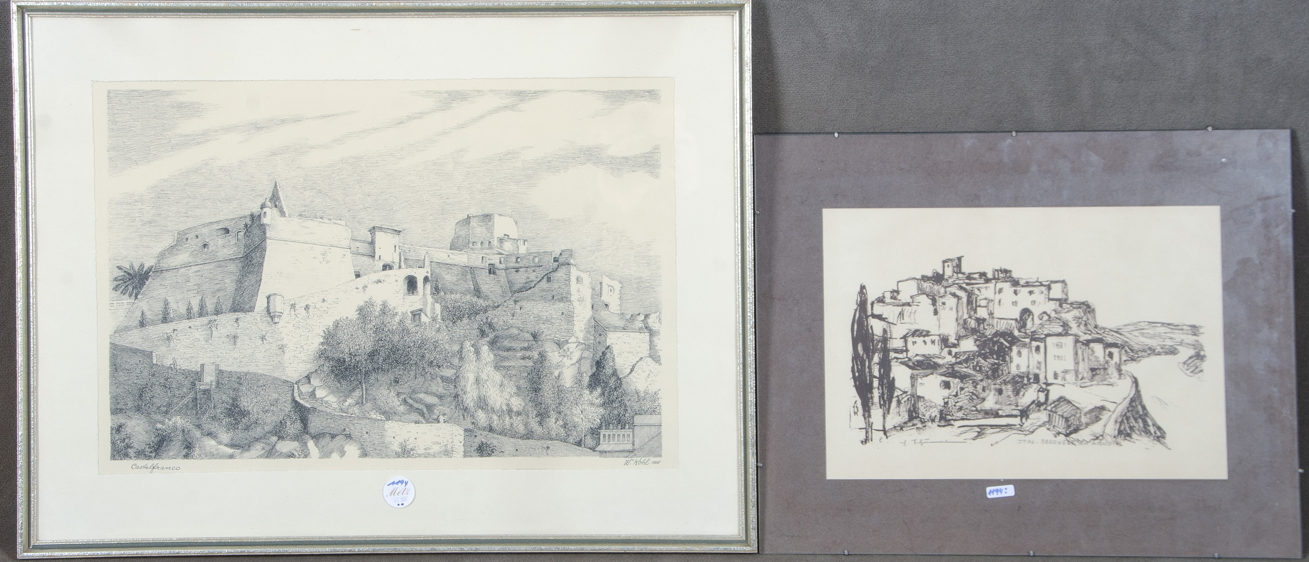 - Katalog-Nr: 1194W. Kohl (Graphiker des 20. Jhs.) u.a. Ansicht von Castelfranco und Dorf am Arno. Radierung / Lithographie, re./u. unleserlich sign./dat. 1958, li./u./sign., eines mit Passepartout, je hi./Gl. gerahmt, 26 x 37 / 36,5 x 57 cm.o.L.