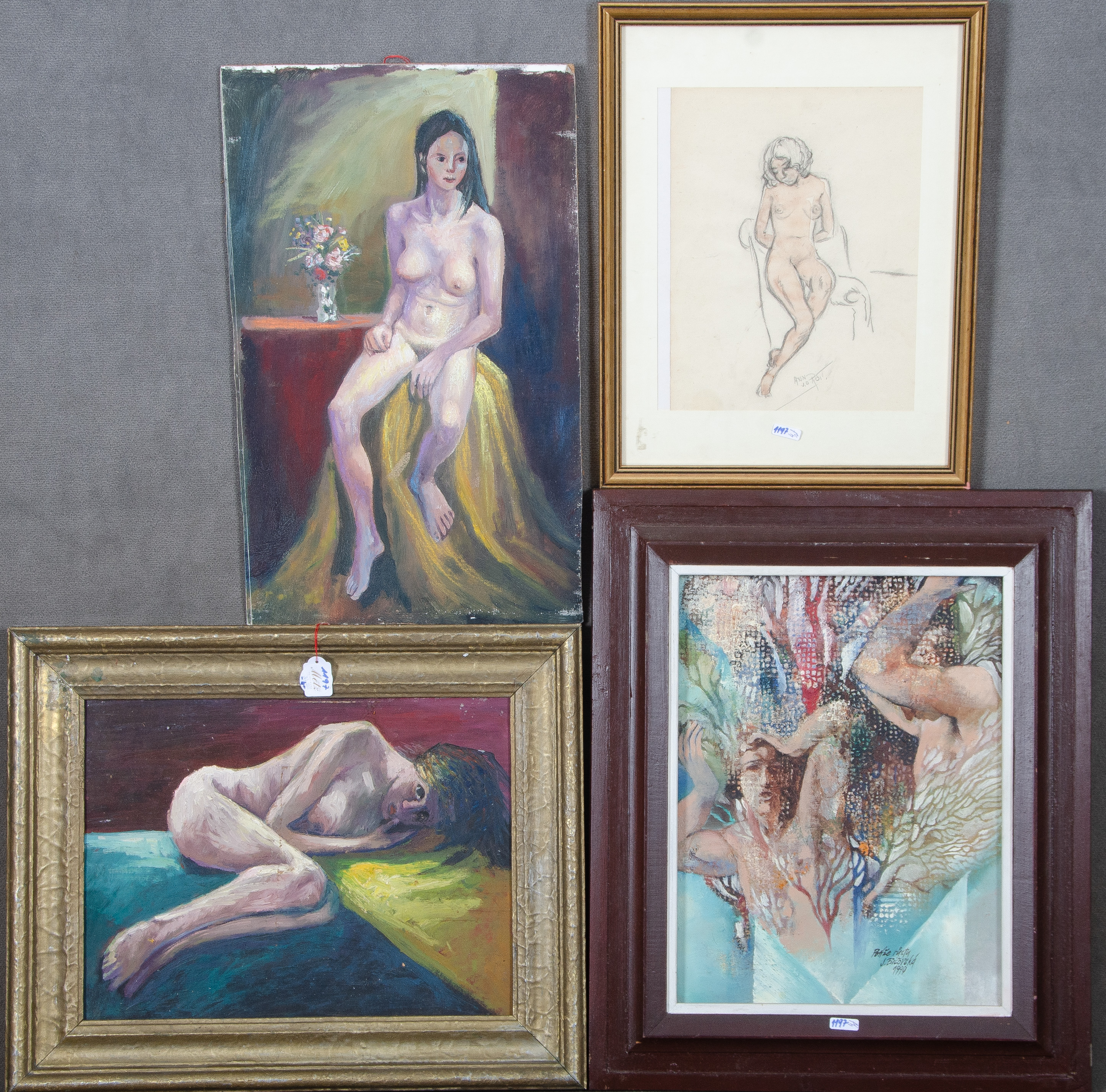 - Katalog-Nr: 1197Vier Gemälde mit Aktdarstellungen: Annie van de Ruit (1904-1992), Mischtechnik, mittig/u./sign.; Albert Klauser (1913-1990), Öl/Malkarton, eines verso bez.; Jaroslava Bicovská (*1945), Öl/Lw., re./u./sign., eines mit Passepartout hi./Gl., meist gerahmt, 29 x 22 bis 51 x 31 cm.o.L.