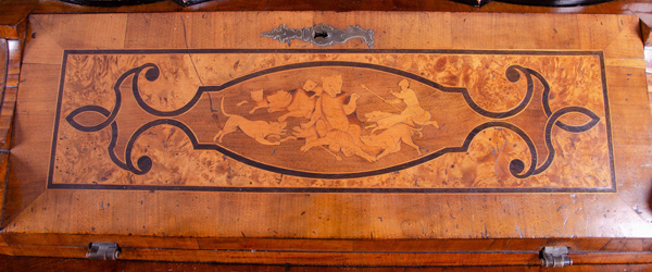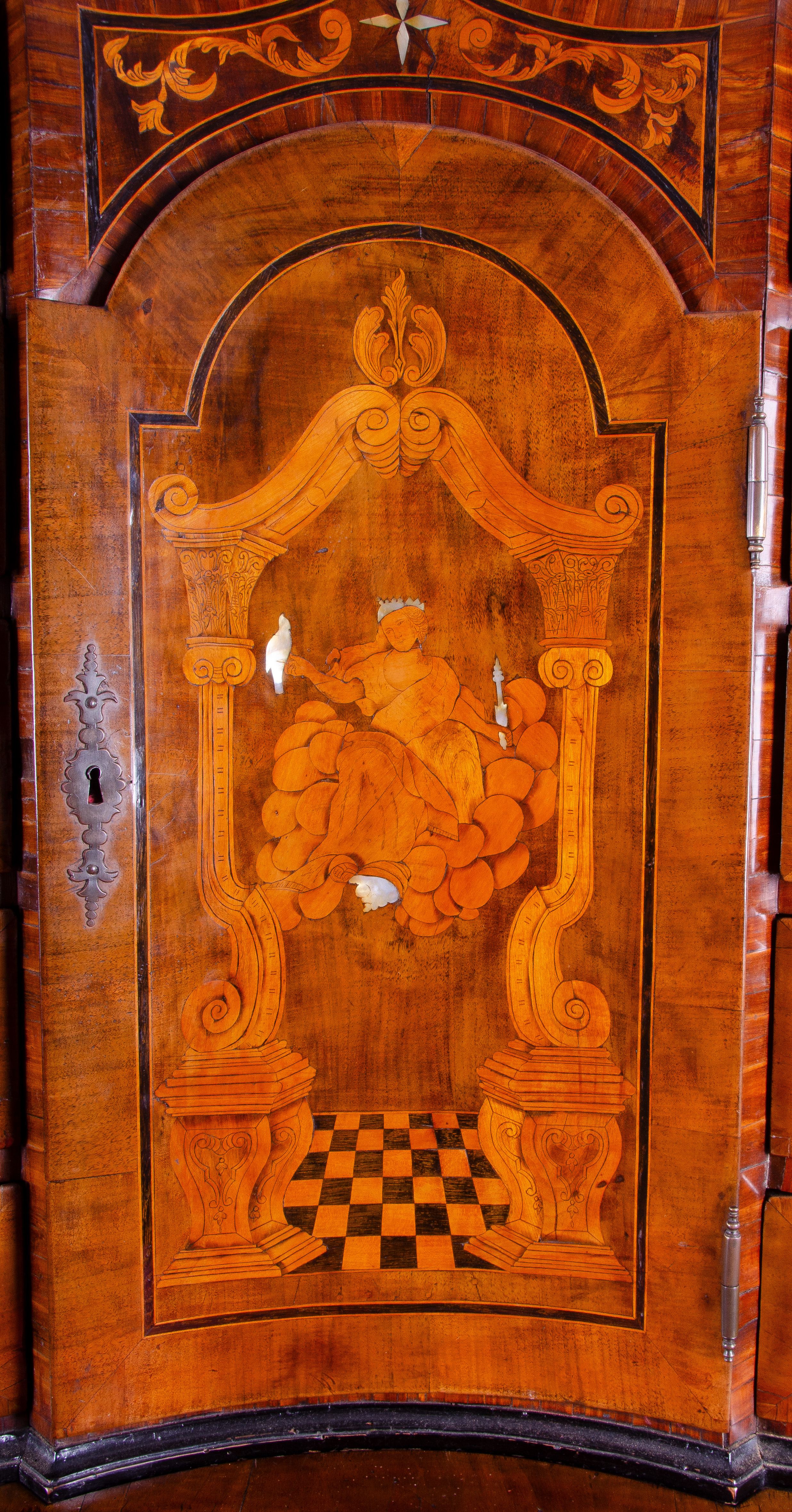 - Katalog-Nr: 1200Tabernakel. Württemberg um 1730-40. Nussbaum, Zwetschge und Vogelaugenahorn furniert, marketiert und schattiert mit Band- und Fadenmuster, Blüten, Blättern, mythologischen Figuren, Jagdszenen, Tauben und Vögel an den Seiten, Umleimer und Kugelfüße ebonisiert, Messingbeschläge; dreischübig, doppelt gebauchte Front, Schreibklappe mit Inneneinteilung, flankiert von je zwei Schüben, Aufsatz der Form des Unterbaus folgend, Tabernakeltür flankiert von je fünf Schüben, geschweifter, profilierter Giebel. (alte Patina), H=210 cm, B=125 cm, T=67 cm.o.L.