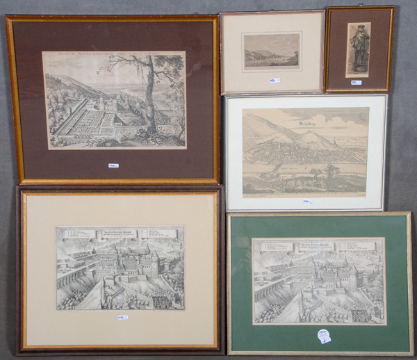 - Katalog-Nr: 1180Matthäus I. Merian (1593-1650). Ansichten des Heidelberger Schlosses. Drei Kupferstiche, mit Passepartout hi./Gl. gerahmt (je 25 x 35 cm); dazu zwei Rahmen und Stich mit Heidelberger Ansicht.o.L.