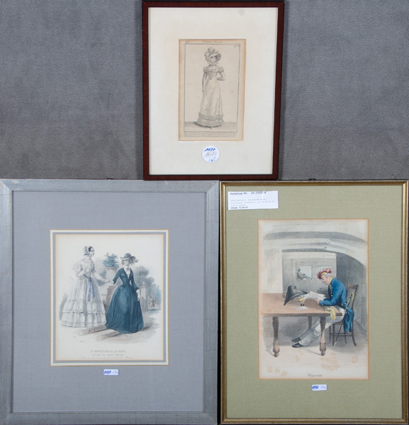 - Katalog-Nr: 1187Jules David (1808-1892) u.a. Blatt aus der Serie „Le moniteur de la mode“. Colorierter Stahlstich, re./u./sign.; dazu „Physician“, Farblithographie, und „Costume Parisienne“, Stich, beide unsigniert. Je mit Passepartout hi./Gl. gerahmt, 19,5 x 9 bis 28 x 19 cm.o.L.