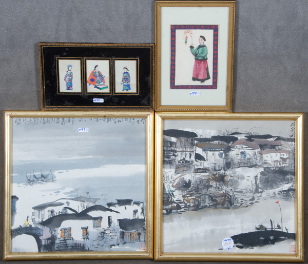 - Katalog-Nr: 1199Asiatischer Maler des 20. Jhs. Zwei Stadtansichten und zwei Darstellungen von Personen in traditionellen Gewändern. Vier Mischtechniken, teilw. mit Stempelsignatur, teilw mit Passepartout, je hi./Gl. gerahmt, 8,5 x 5 bis 34 x 33 cm.o.L.