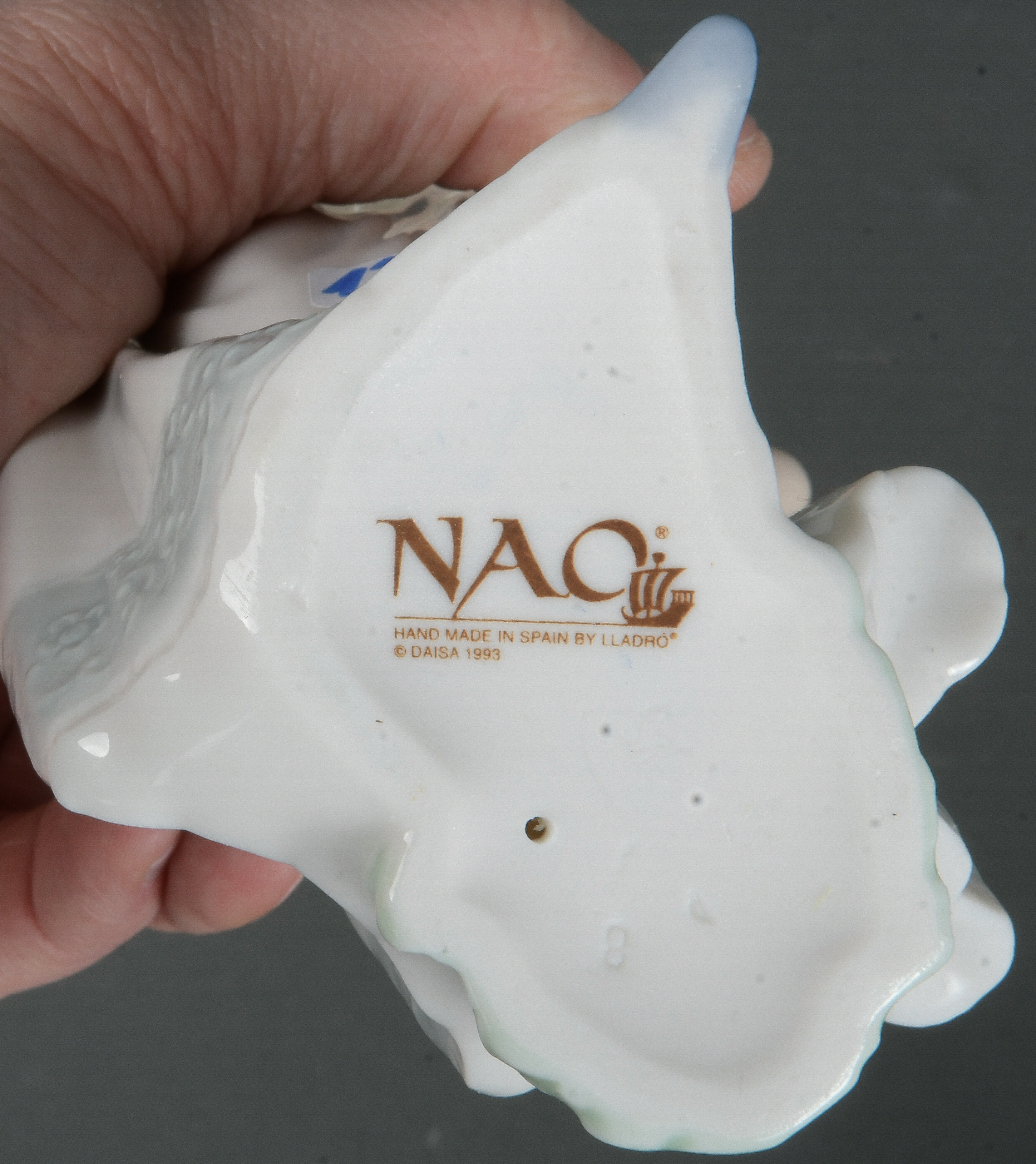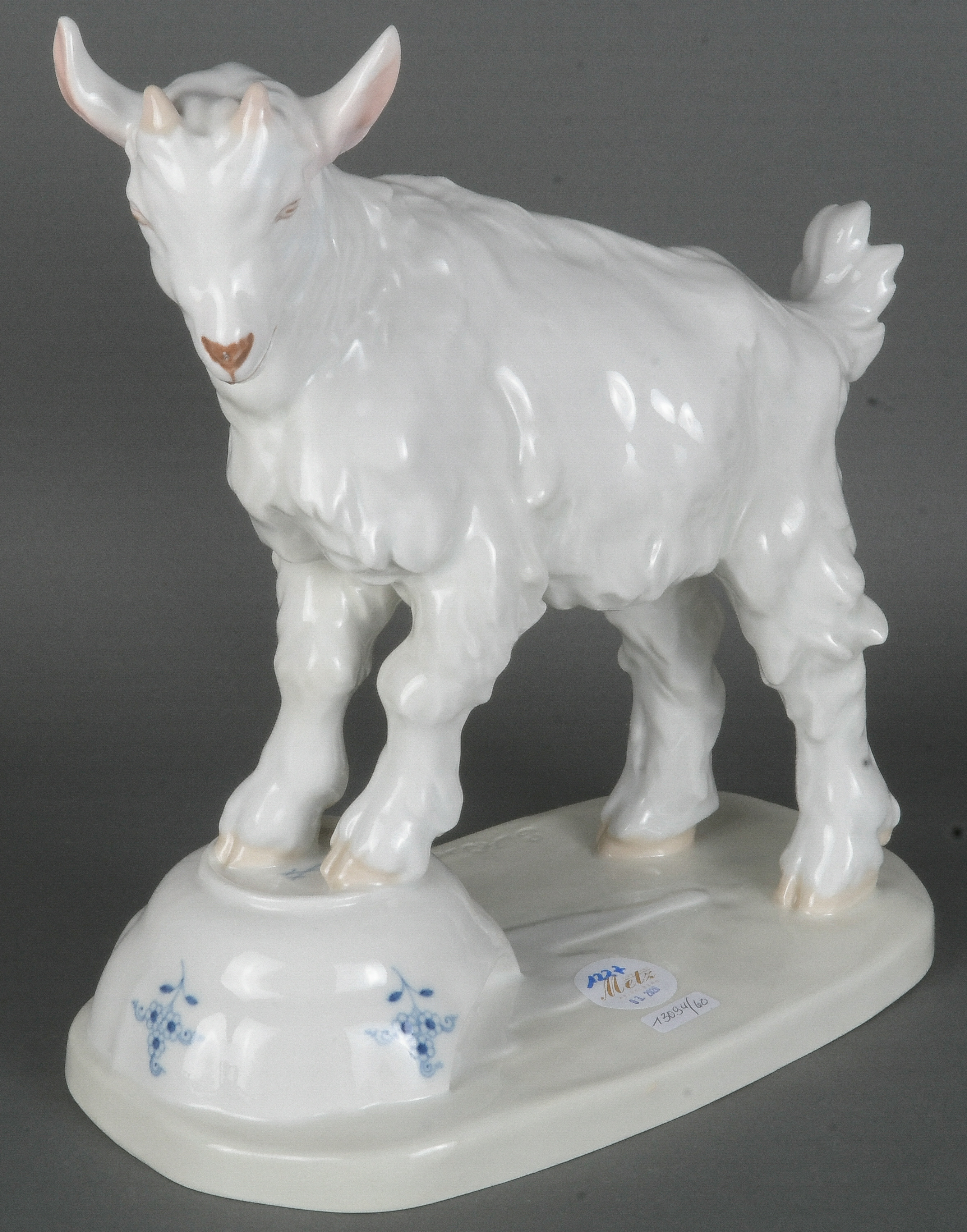 - Katalog-Nr: 1227Zicklein auf zerbrochener Zwiebelmusterschale. Meissen 20. Jh. Porzellan, sparsam bemalt, verso am Sockel unterglasurblaue Schwertermarke, Formnummer „V. 107“ . Entwurf und sign. E.(rich) Hösel, H=32 cm.o.L.