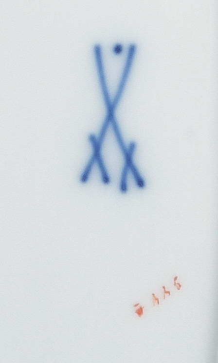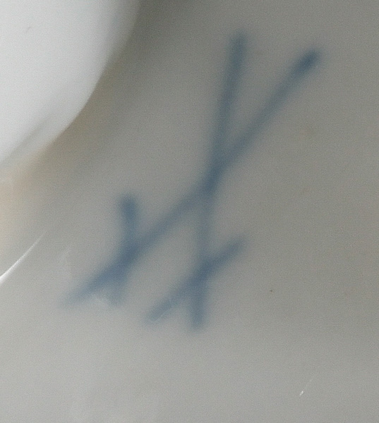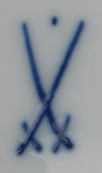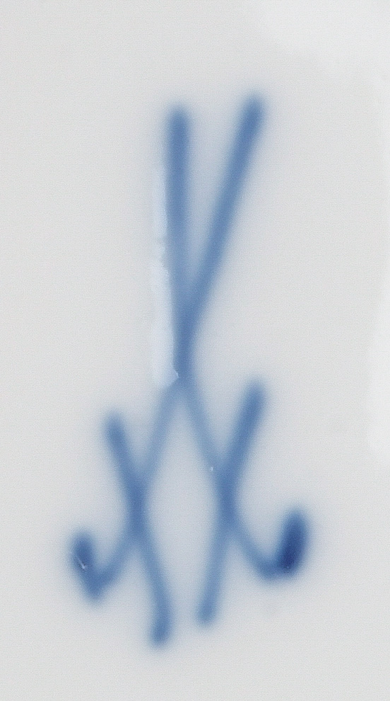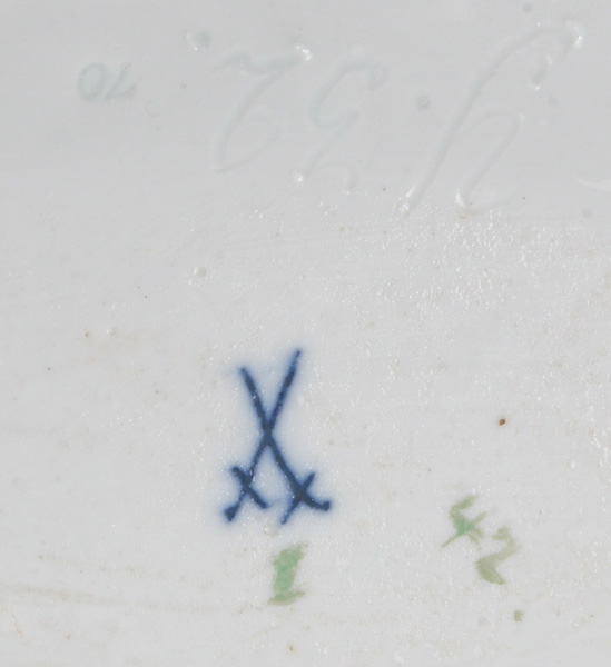 - Katalog-Nr: 123921-tlgs. Prunkservice. Meissen Pfeifferzeit 1924–34. Porzellan, exzellent bunt bemalt mit heimischen Vögeln auf Ästen, umgeben von Insekten, Ränder gold gesäumt; am Boden unterglasurblaue Schwertermarke. Bestehend aus: Sechs Speiseteller (D=je 24,5 cm), sechs Suppenteller (D=je 24 cm), eine Saucière (H=9,5 cm, B=24 cm, T=19 cm), eine große ovale Terrine (H=26 cm, B=35 cm, T=22 cm), eine ovale Platte (35 x 25 cm), eine runde Gemüseschüssel mit Deckel (H=18 cm, D=27 cm), eine quadratische Schüssel (H=10 cm, B=23 cm), ein Paar ovale Schalen (je 25 x 17 cm) und ein Paar runde Schalen (D=je 25 cm).o.L.
