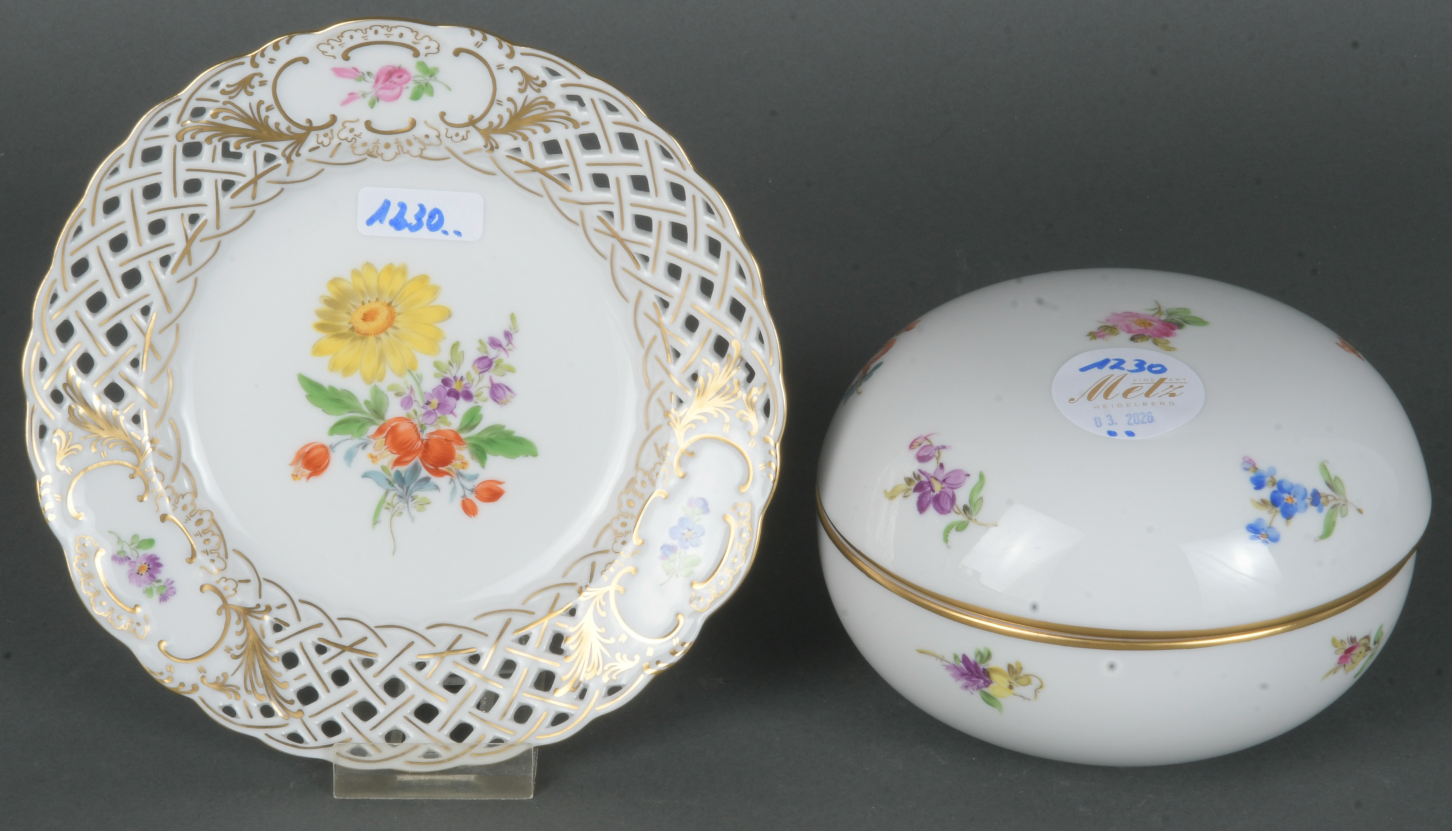 - Katalog-Nr: 1230Zweitlgs. Konvolut Meissen 20. Jh. Porzellan, bunt bemalt mit Floraldekor; am Boden unterglasurblaue Schwertermarke. Bestehend aus: Eine runde Deckeldose (H=8 cm, D=12,4 cm) und ein Dessertteller (D=15,5 cm).o.L.