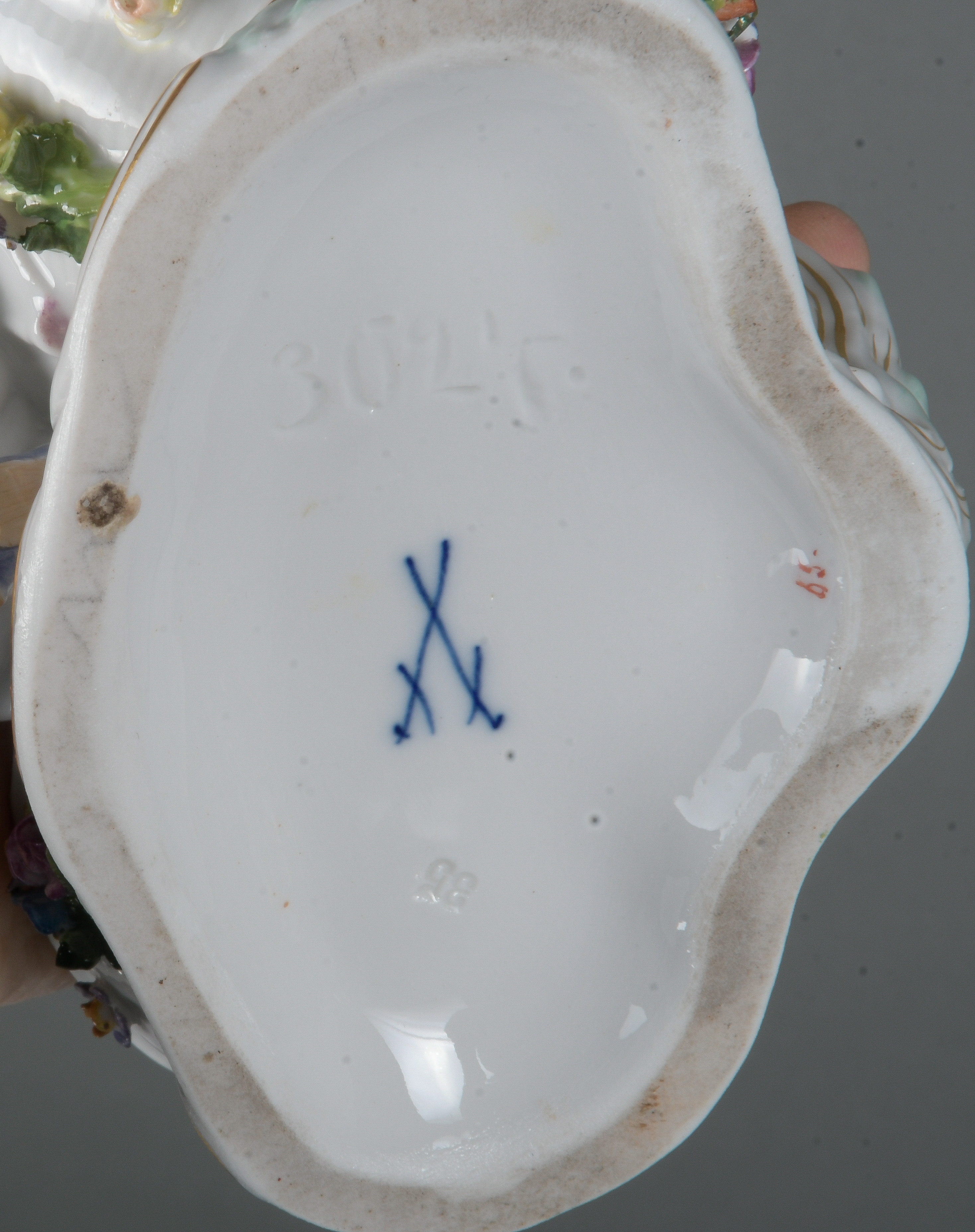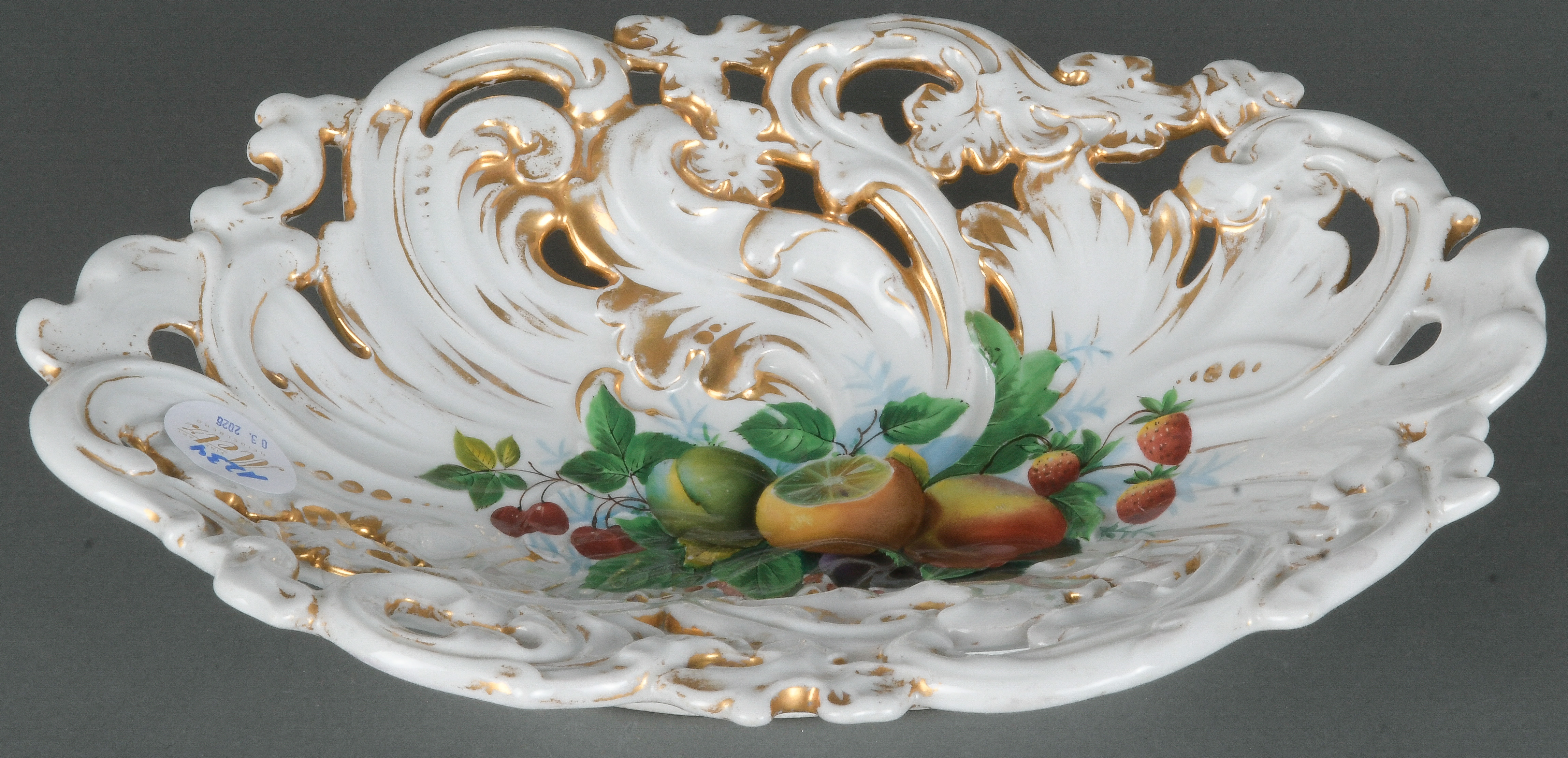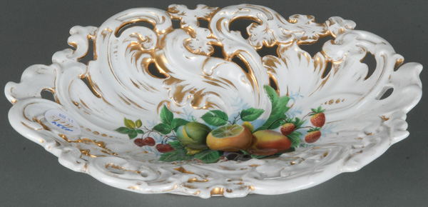 - Katalog-Nr: 1234Ovale Durchbruchsschale. Meissen 19. Jh. Porzellan, bunt bemalt mit Obstbouquet, gold gesäumt; verso unterglasurblaue Schwertermarke, H=6,5 cm, B=32 cm, T=24,5 cm.o.L.