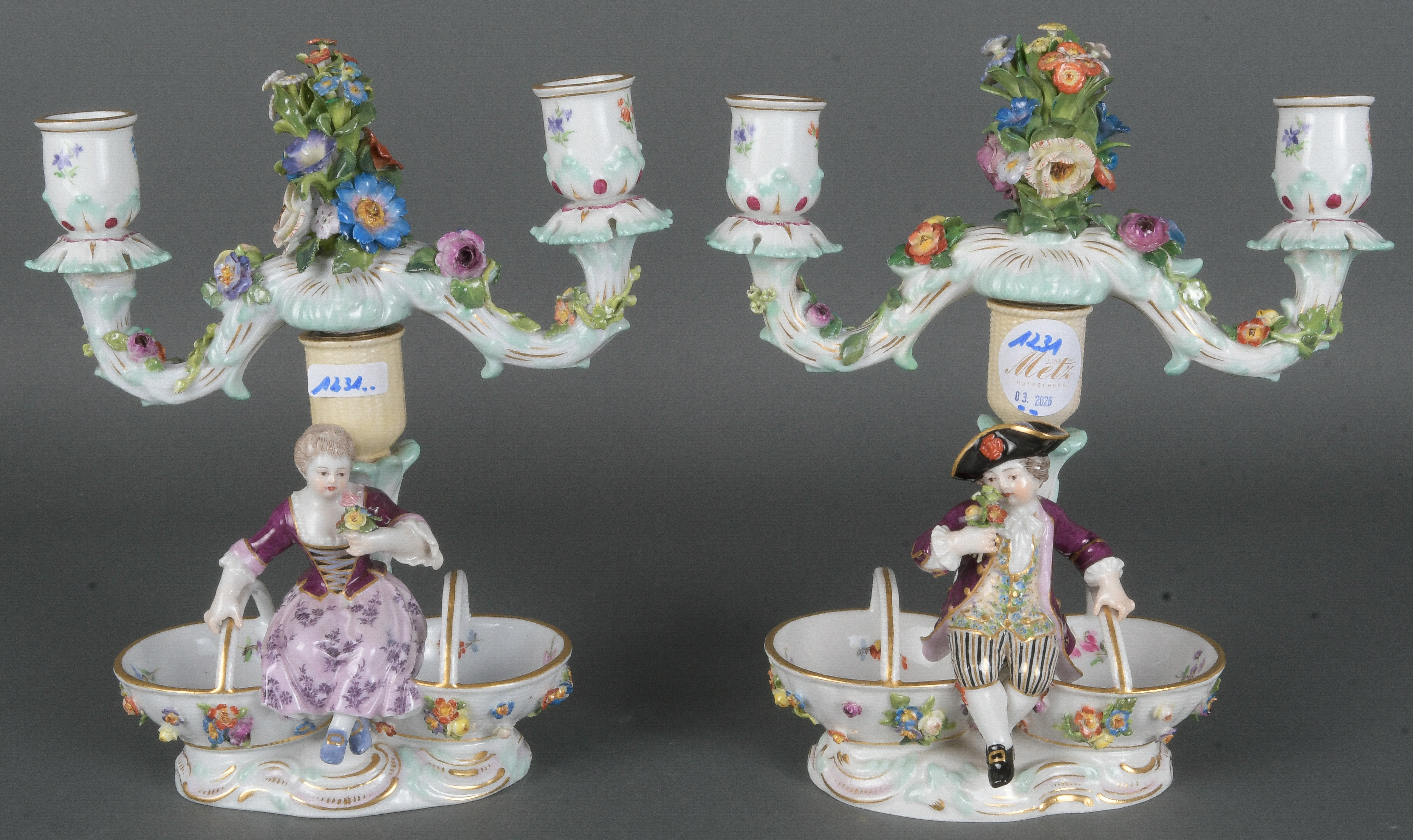 - Katalog-Nr: 1231Paar Gewürzkörbe mit zweiflammigen Girandolenaufsätzen. Meissen 19. Jh. Porzellan, bunt bemalt mit Floraldekor, Goldränder, aufbossierter Blüten- und Blätterdekor; am Boden unterglasurblaue Schwertermarke, Modelle nach Johann Joachim Kaendler, H=25 cm. (min. best. / min. rest.).o.L.
