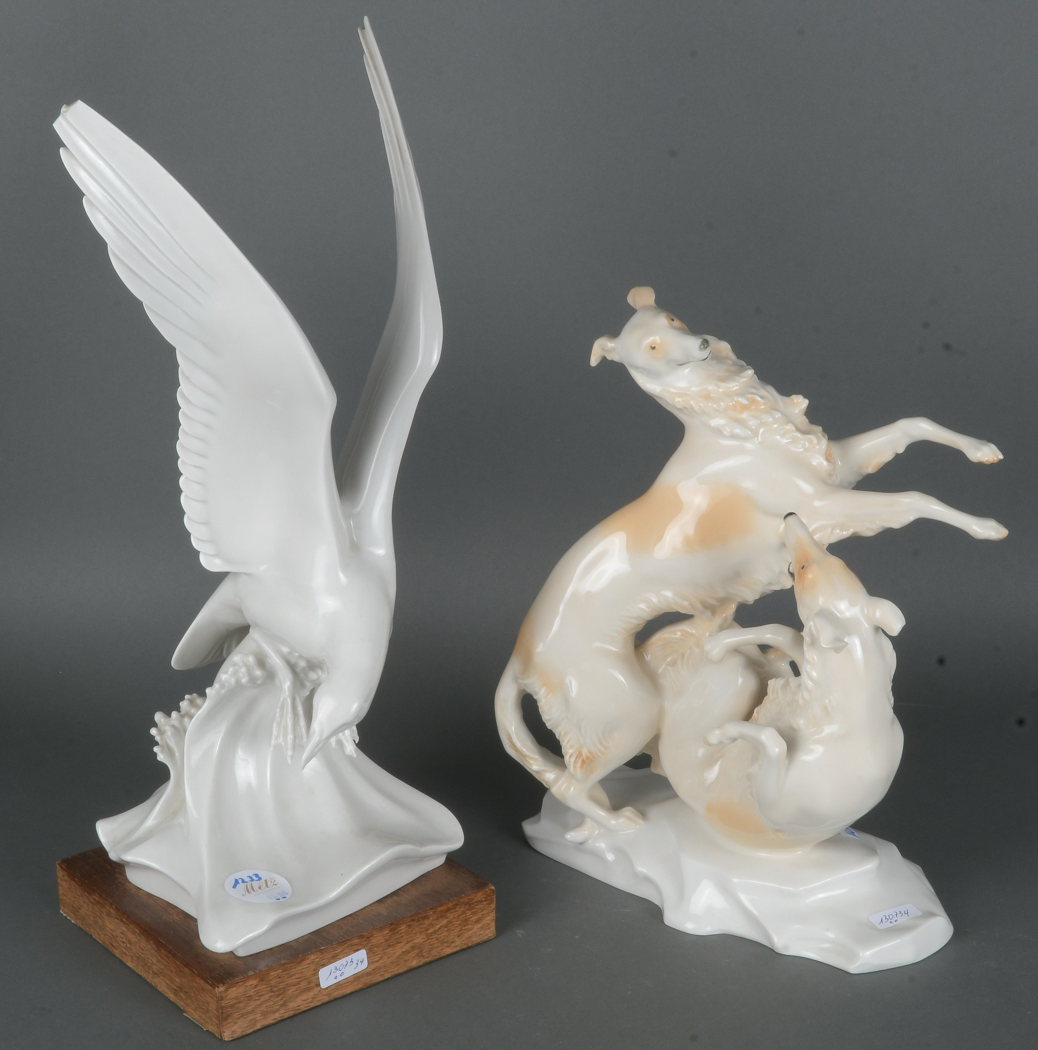 - Katalog-Nr: 1233Spielende Windhunde und Möwe. Hutschenreuther / Meissen 20. Jh. Porzellan, bunt bemalt bzw. weiß glasiert, am Boden Stempelmarke bzw. Schwertermarke mit zwei Schleifstrichen, Entwurf und monogr. „MF“ für Max Hermann Fritz bzw. Max Esser, H=29,5 / 41,5 cm. (besch.)o.L.