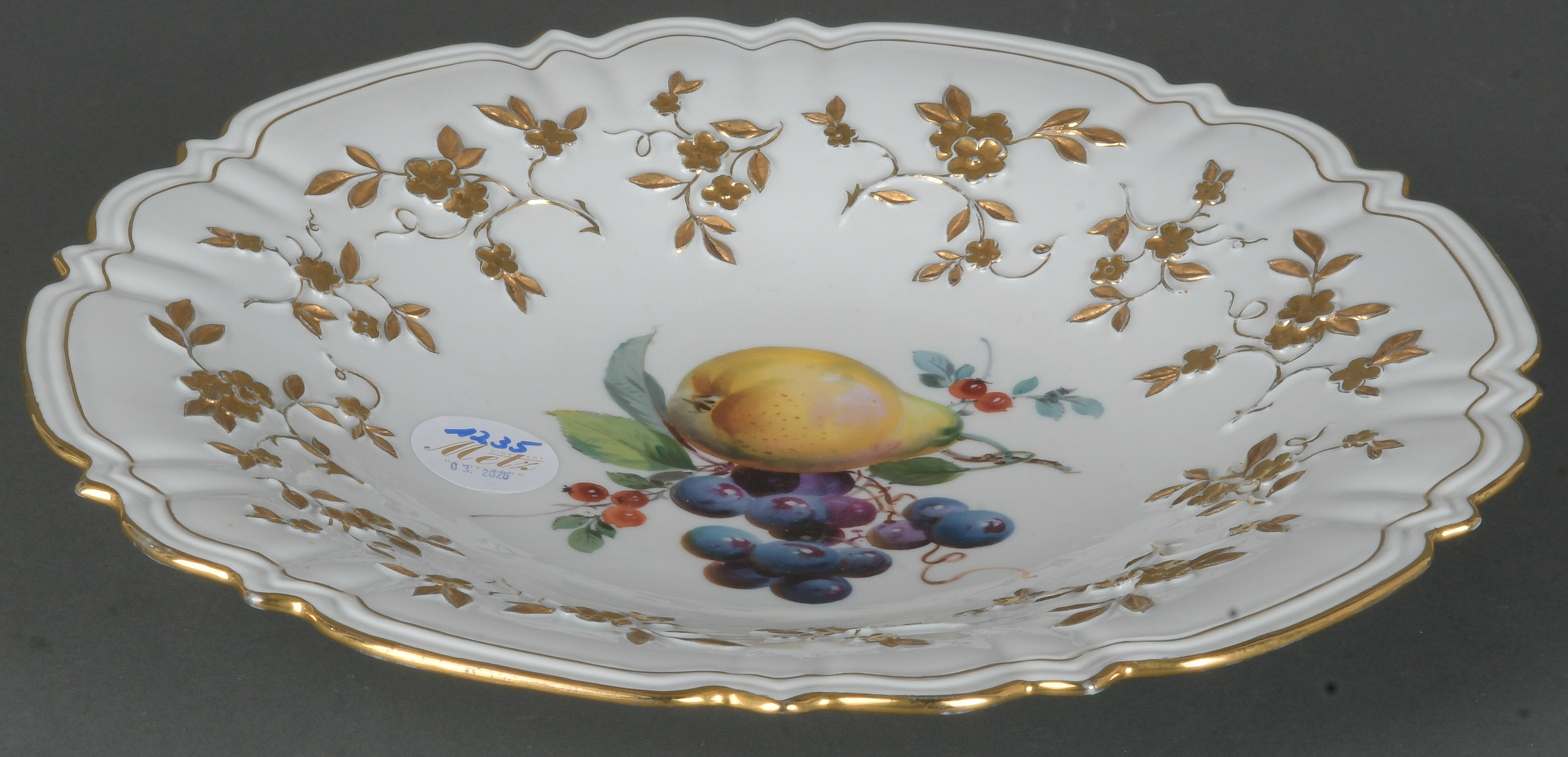 - Katalog-Nr: 1235Runde Prunkplatte. Meissen Pfeifferzeit 1924–34. Porzellan, mit Floralrelief, gold gehöht und bunt bemalt mit Obstbouquet; verso unterglasurblaue Schwertermarke, D=29,5 cm.o.L.