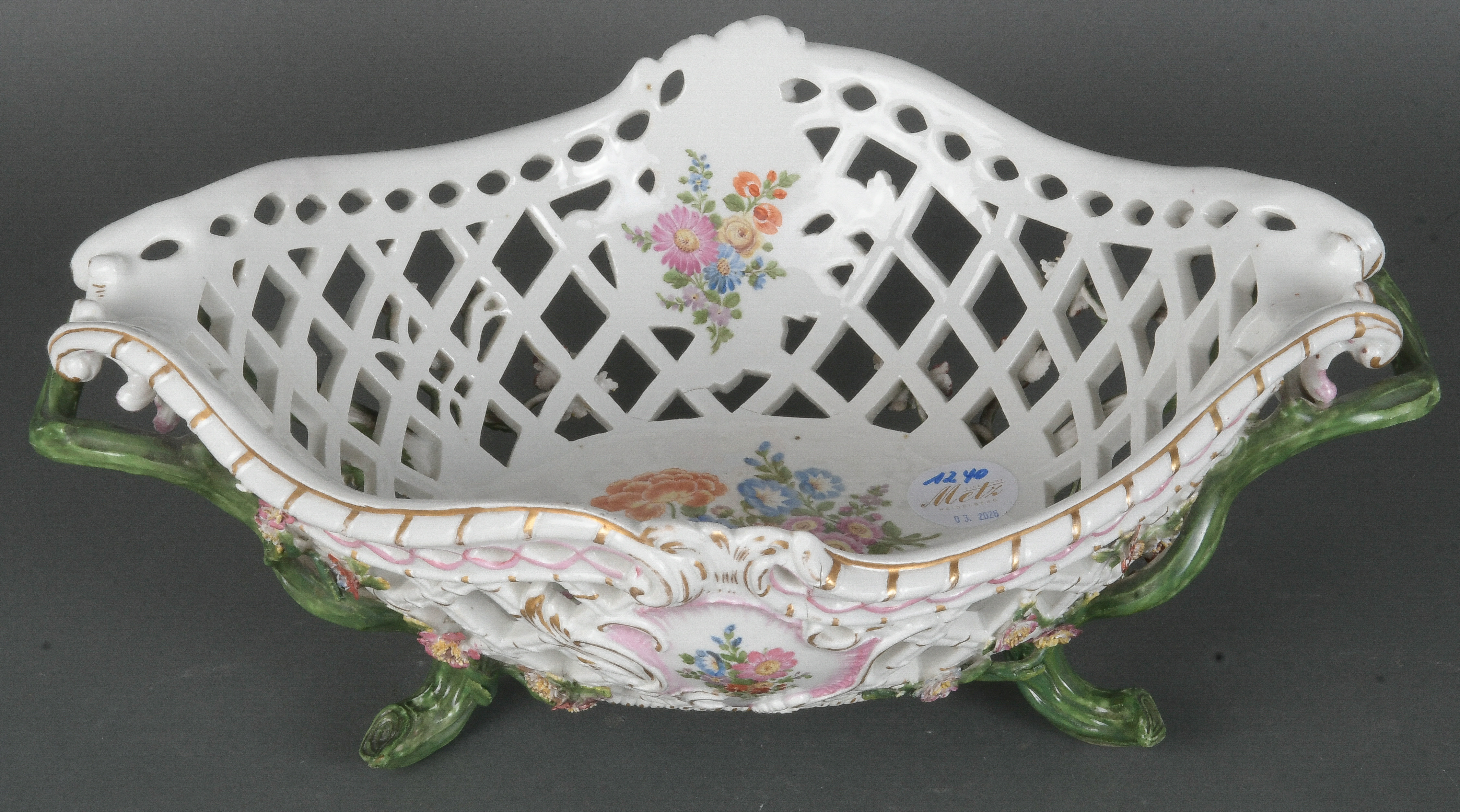 - Katalog-Nr: 1240Ovaler Durchbruchskorb. Meissen-Marcolini 1774-1814. Porzellan, bunt bemalt mit Floraldekor, Goldrand; unterglasurblaue Schwertermarke mit Schleifstrich, H=14 cm, B=37 cm, T=25,5 cm. (rest.)o.L.