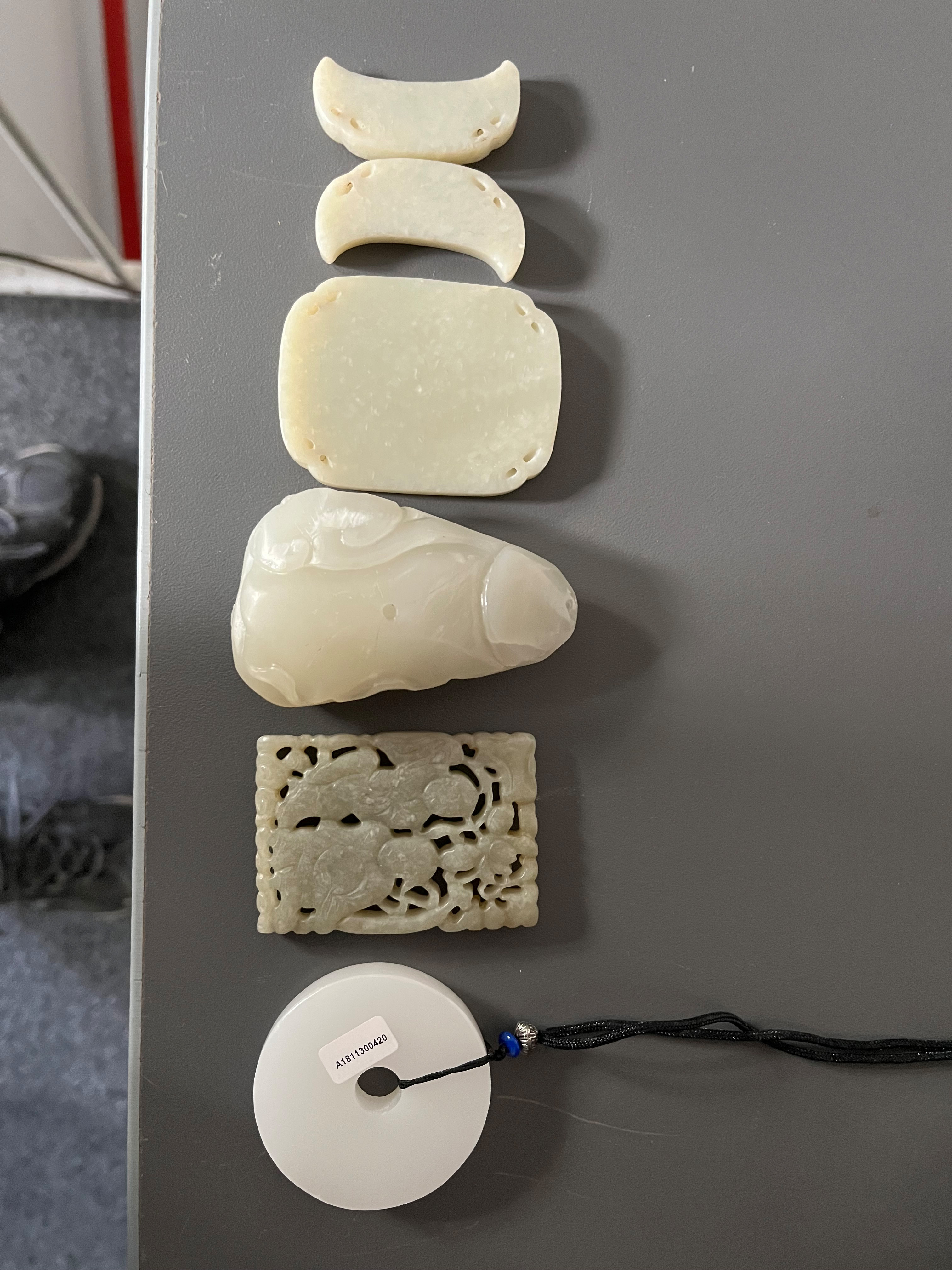 - Katalog-Nr: 1242Sechstlgs. Konvolut Jade. Asien. Darunter ein Anhänger (D=5,1 cm) und kleine Tafeln (6,1 x 4,8 / 6,4 x 4,5 cm).o.L.