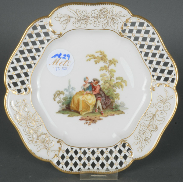 - Katalog-Nr: 1229Dessertteller. Meissen 19. Jh. Porzellan, bunt bemalt mit Watteauszene in Parklandschaft, Fahne mit Reliefblüten, gold gesäumt; verso unterglasurblaue Schwertermarke, D=19 cm.o.L.